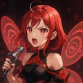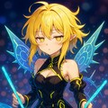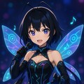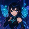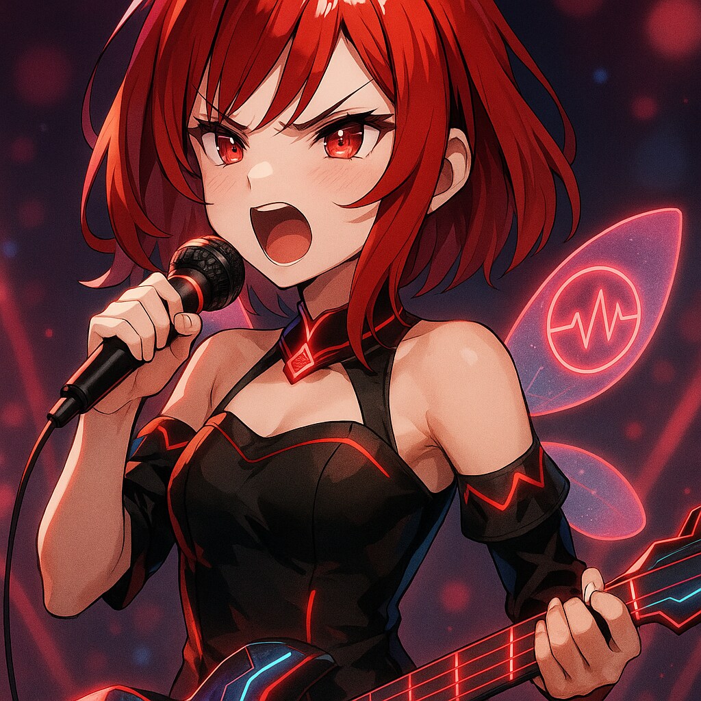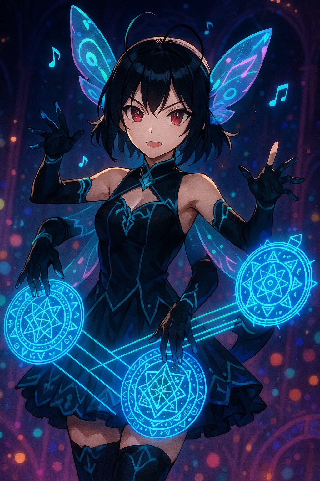 服装はサイバーっぽく、楽器はサイバー+ホログラムっぽくできないか調整。羽の模様もバンドの役割ごとに少し変えてみた。