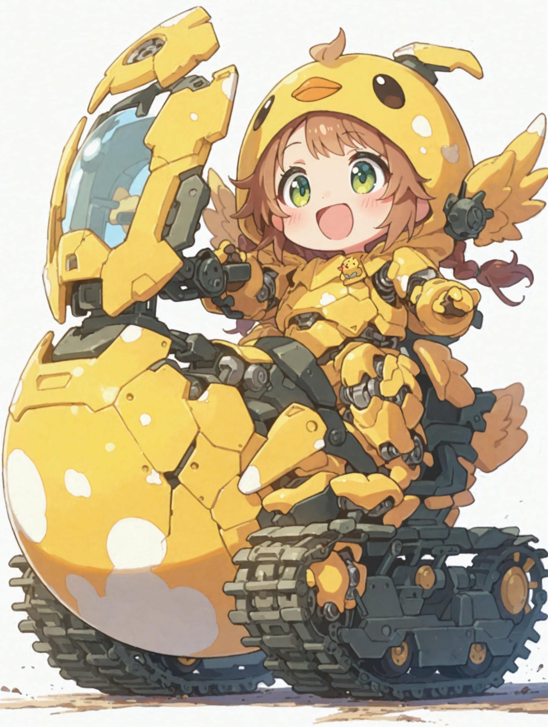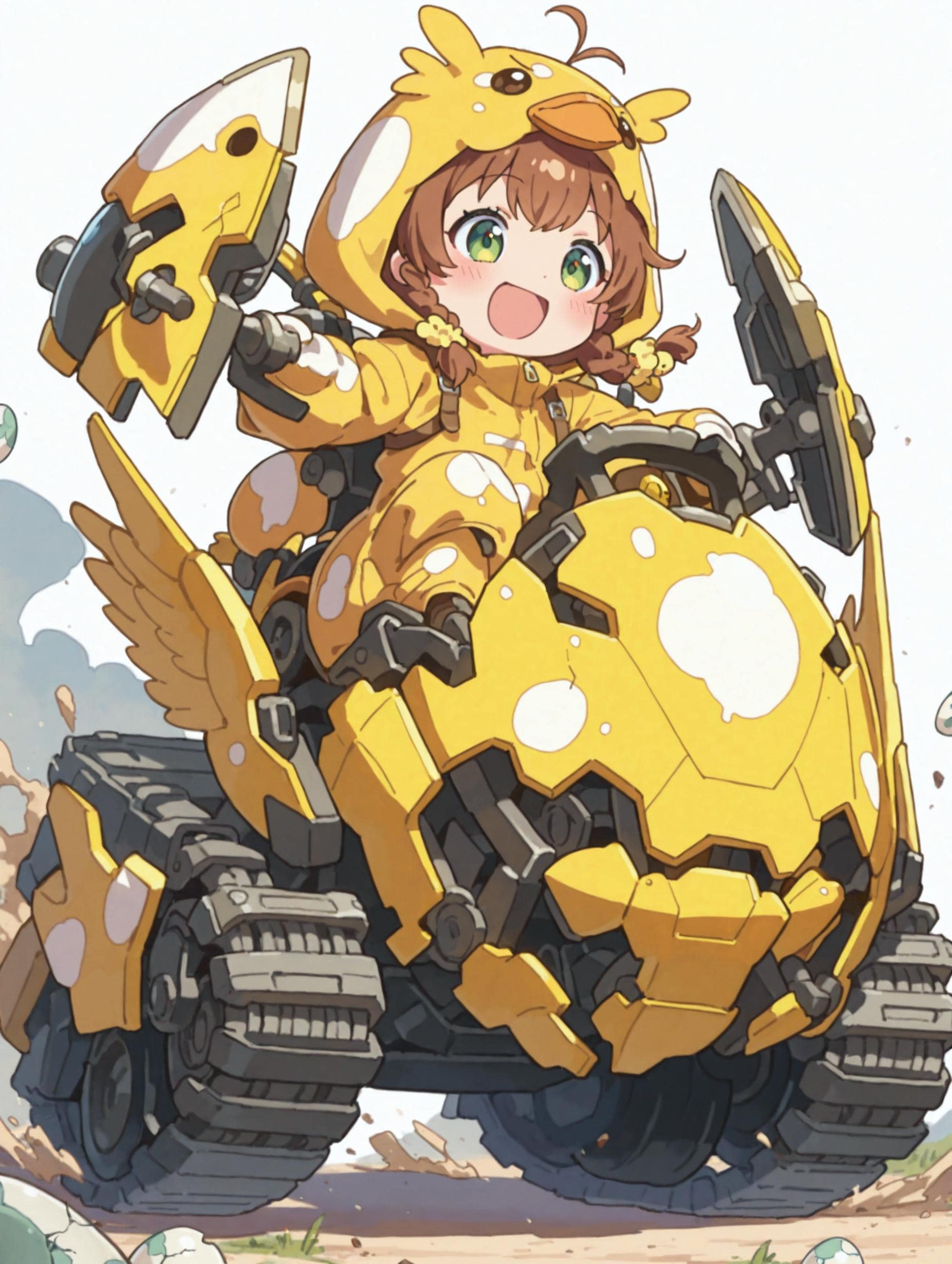 a tiny chibi girl in a fluffy yellow chick kigurumi with a cracked egg oversized shield in front, riding on a small tracked base with tank-like treads, smiling cheerfully while advancing, ,her mechanical parts are round and toy-like,the armor is bright yellow with egg and wing motifs, extremely cute and compact mech fusion, anime chibi style