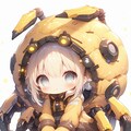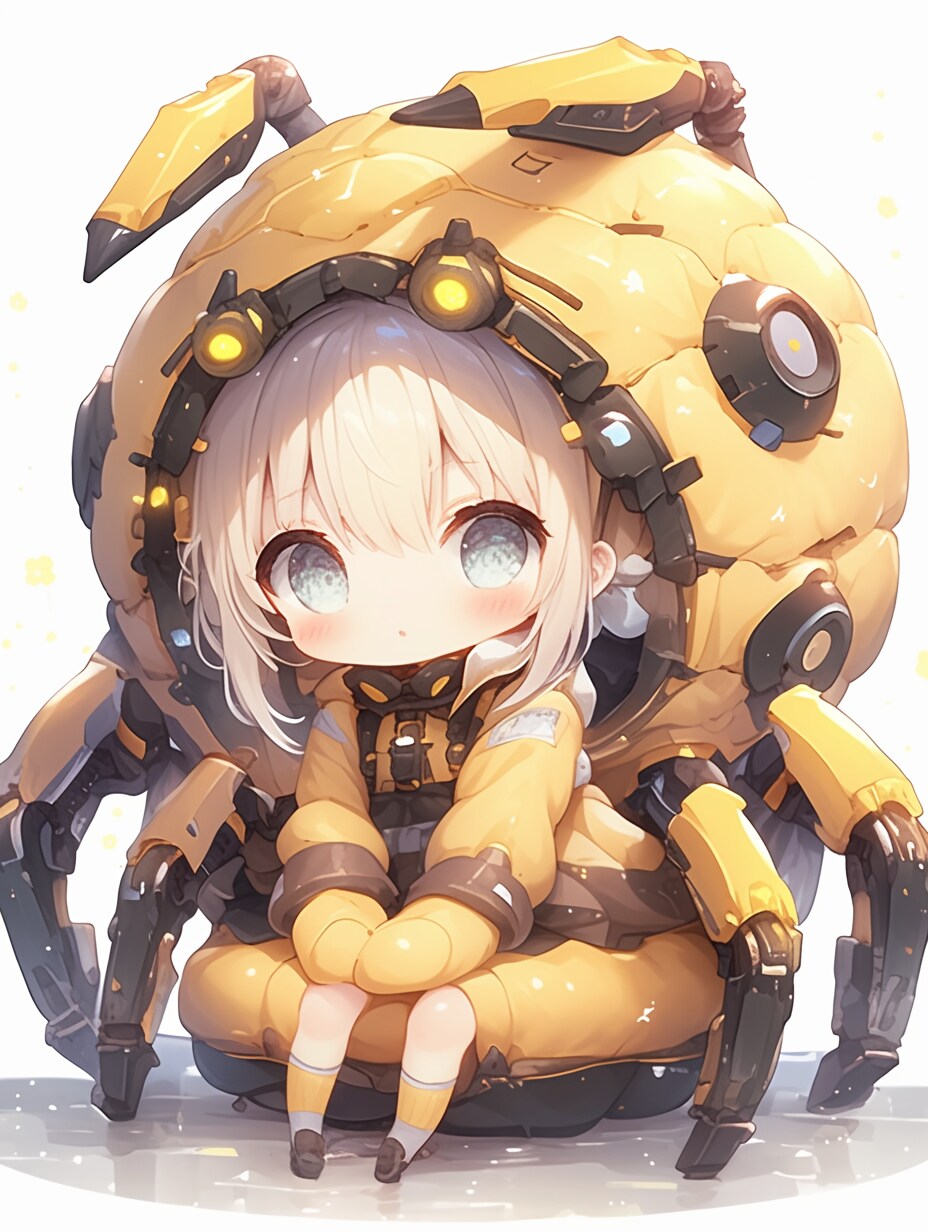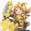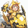 「ひよこの着ぐるみを着たちびキャラの女の子を描きたいです。脚はキャタピラー型のメカで、大きな盾を構えて防御しているようなポーズにしたい。明るくて可愛い雰囲気でお願いします。」