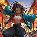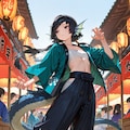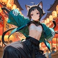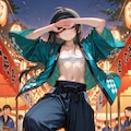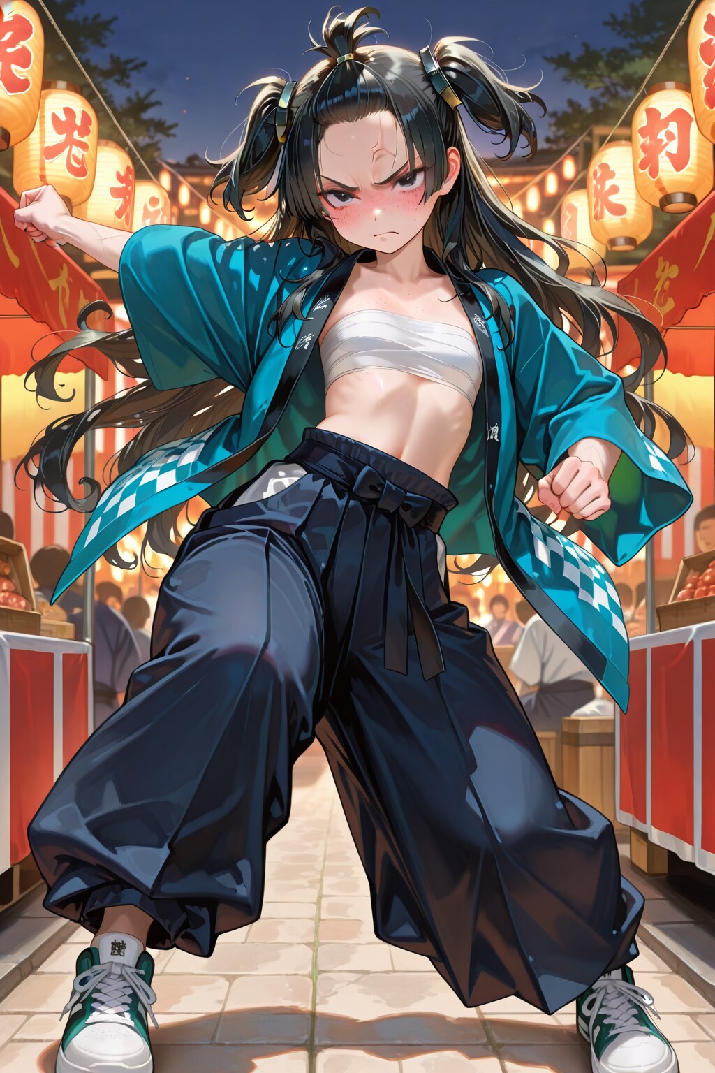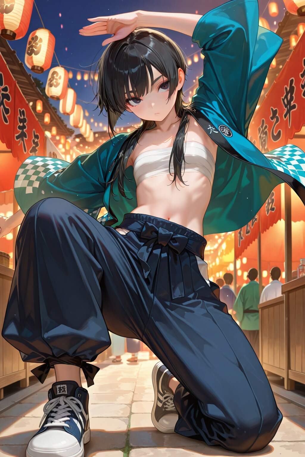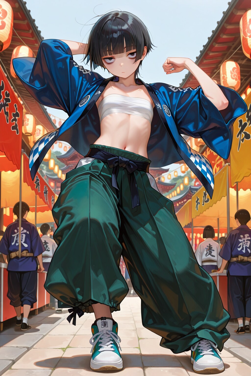 (masterpiece, best quality, ultra-detailed, 8k, hyper detailed), flat chest, reverse trap, chest sarashi, cool, oversized pants, long pants, reverse trap, midriff, baggy pants, sneakers, happi, festival, dynamic pose, (black hair: 1.3), black eyes, 1girl, sanpaku, 20yo, short hair, 160cm tall, bags under eyes, blunt bangs,