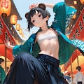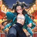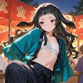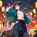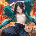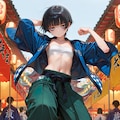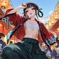 flat chest, reverse trap, chest sarashi, cool, oversized pants, long pants, reverse trap, midriff, baggy pants, sneakers, happi, festival, dynamic pose,