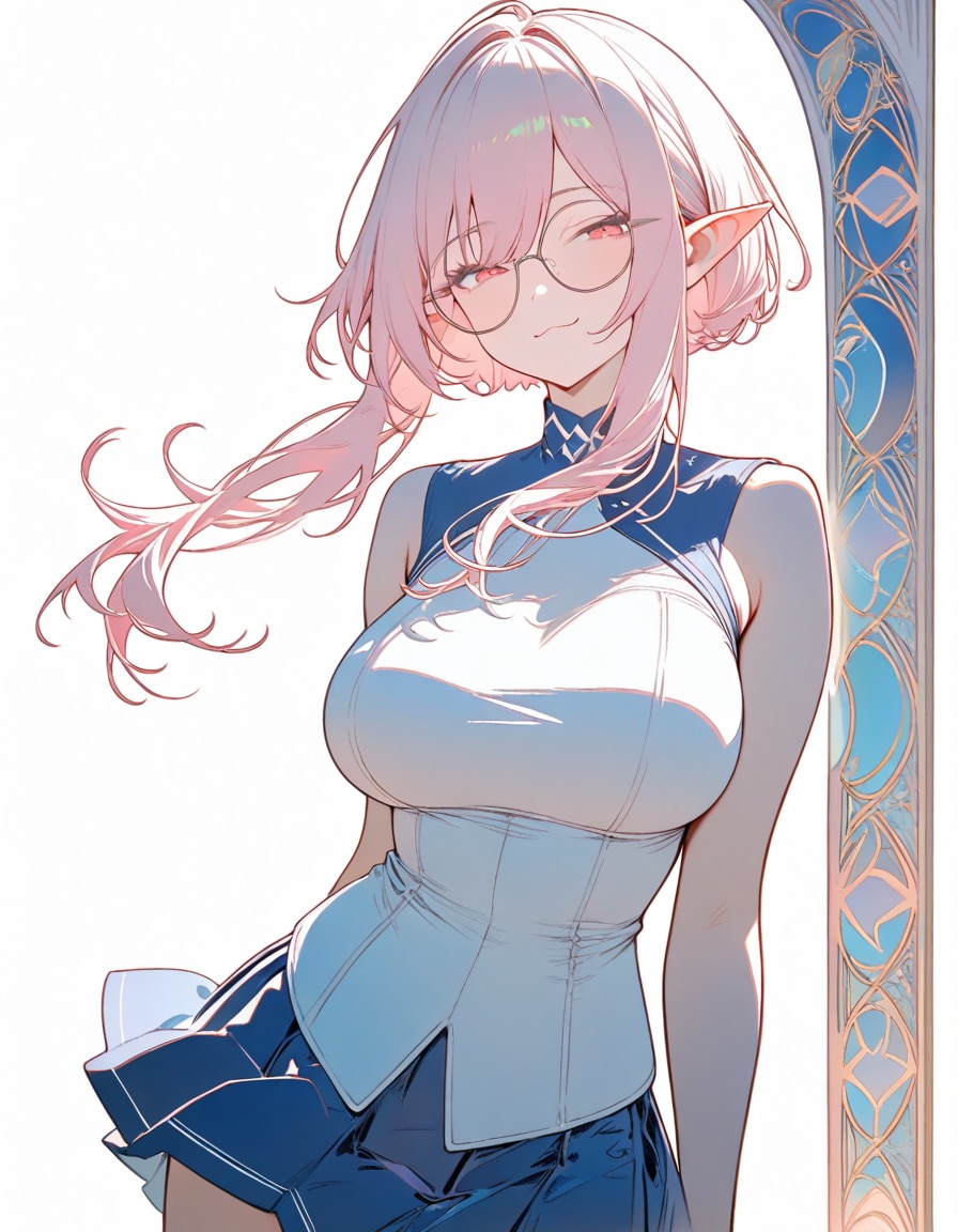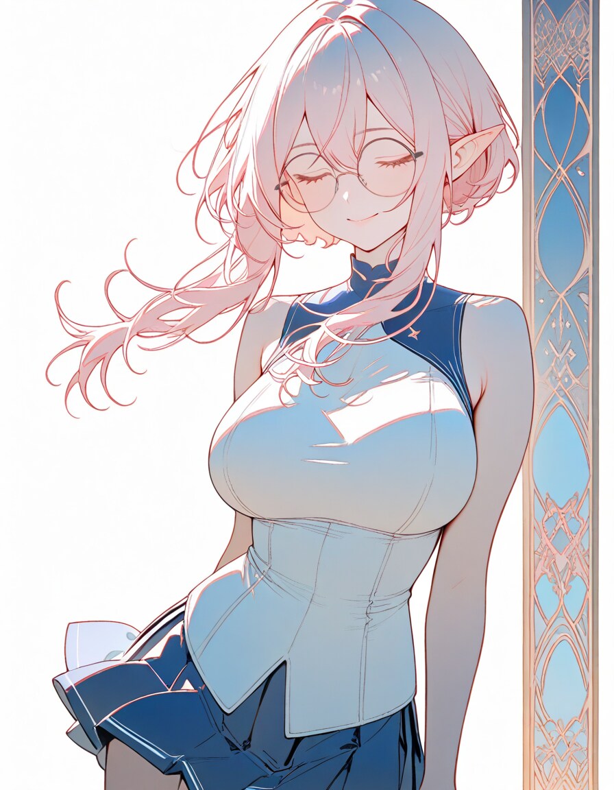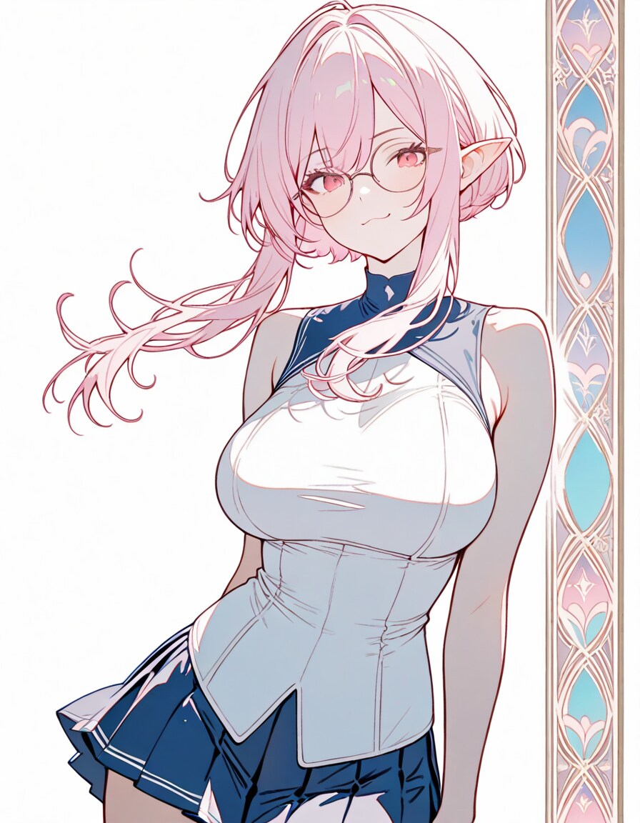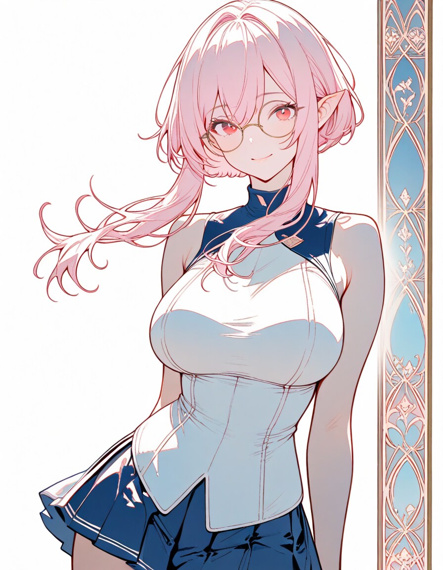 1girl, _, from _, pale pink blonde hair, very short hair, long sidelocks, hair between eyes, round glasses, pointy ears, large breast, high neck no sleeve white school uniform, short [[ blue, red, green ]] skirt, pleated skirt, contrapposto, white background, wind blowing, daylight, [[ smile, expressionless, smug ]] [[ red eyes, red eyes half-closed eyes, closed eyes ]], art nouveau,