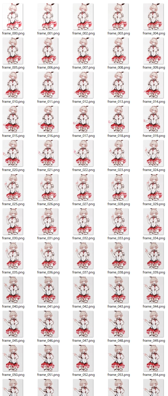 その生成の際に、2枚目の画像の黄色い枠で囲んだところの設定、「フレーム画像保存設定」という箇所の「全フレーム画像保存」を選択すると、outputsフォルダとして指定されているフォルダに、動画の1枚1枚の画像が連番付きで保存れます。(3枚目)