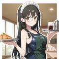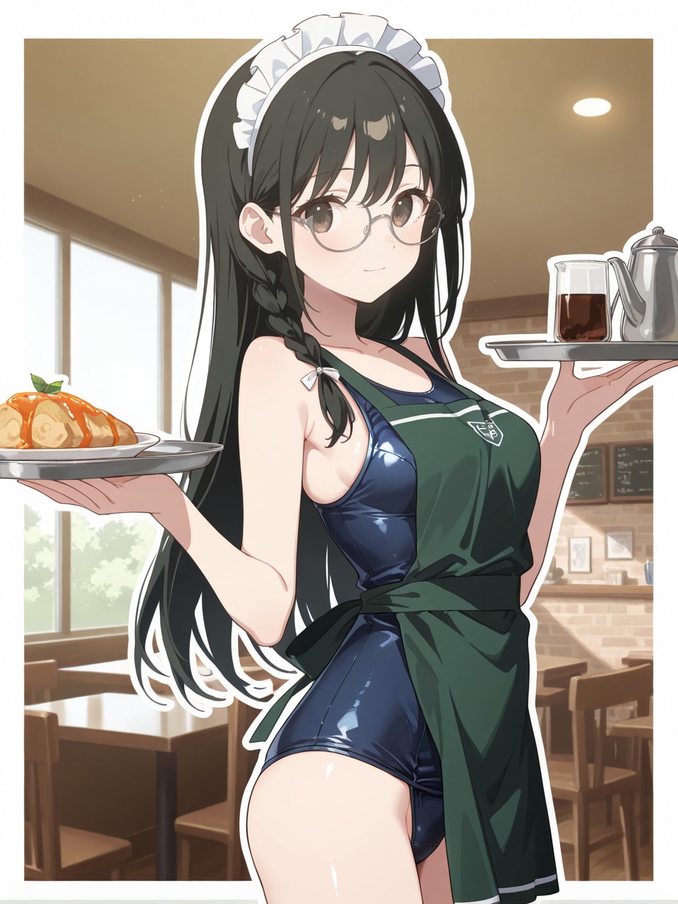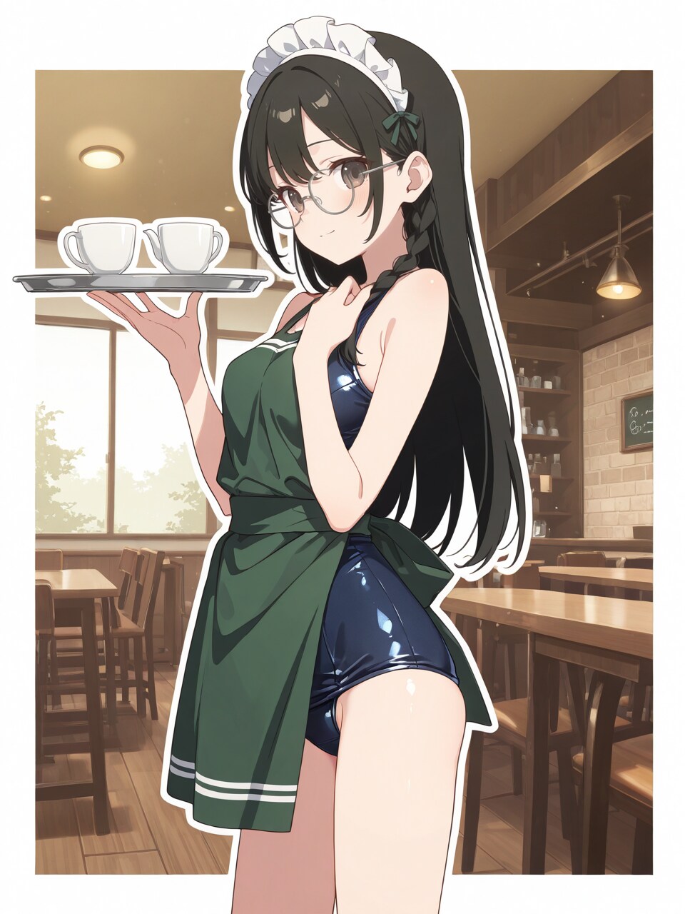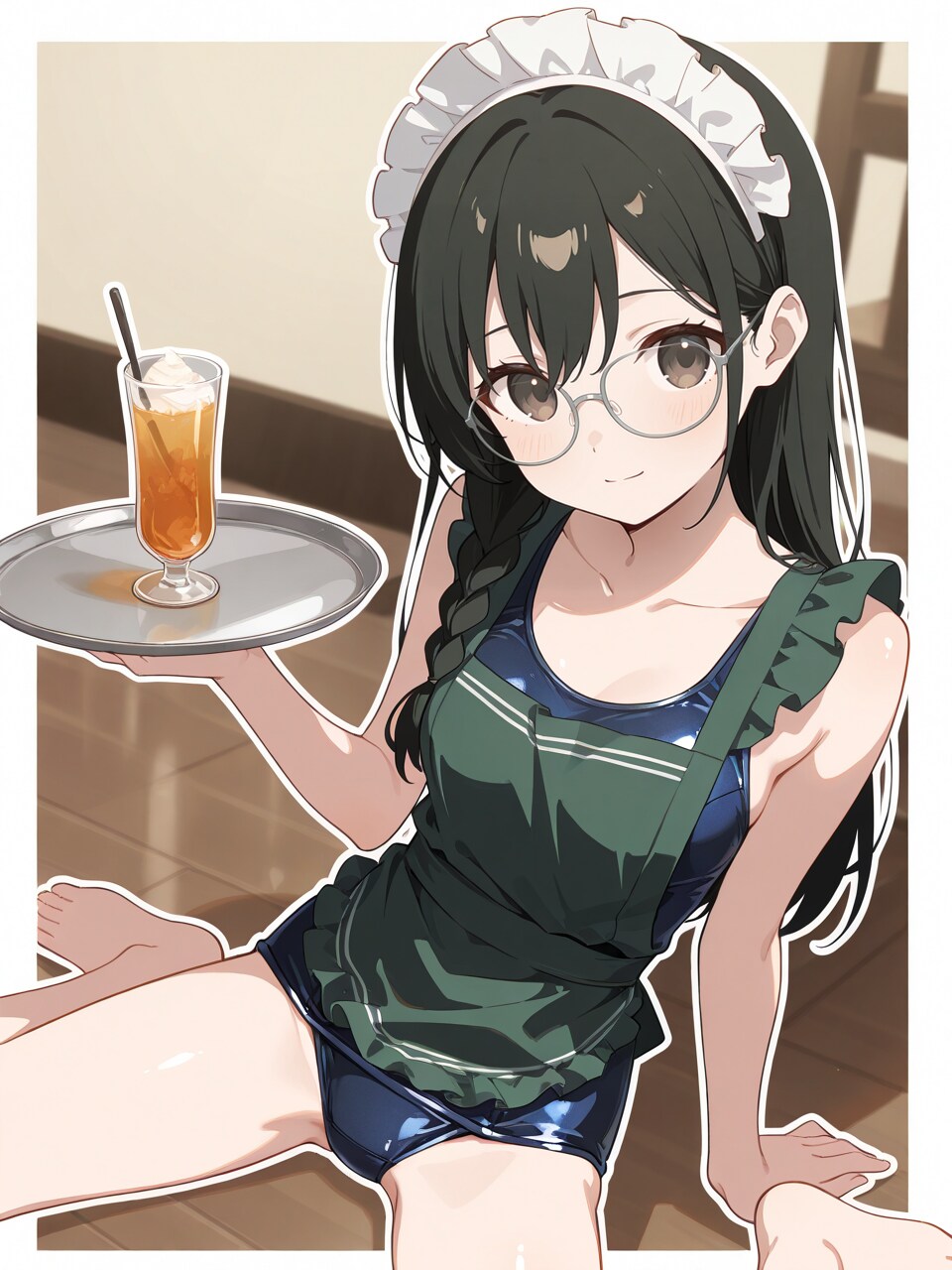 school swimsuit, dark green apron, maid headdress,