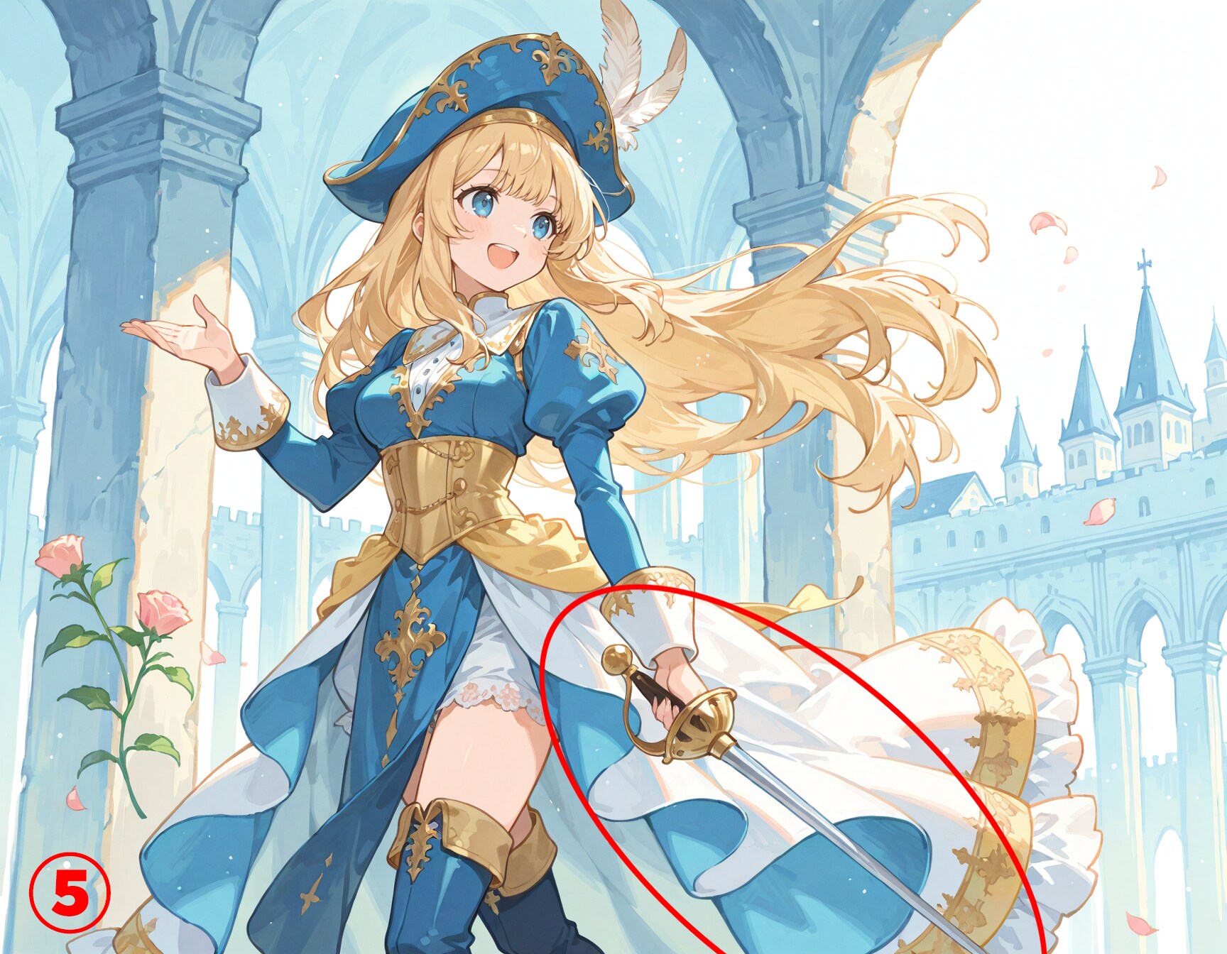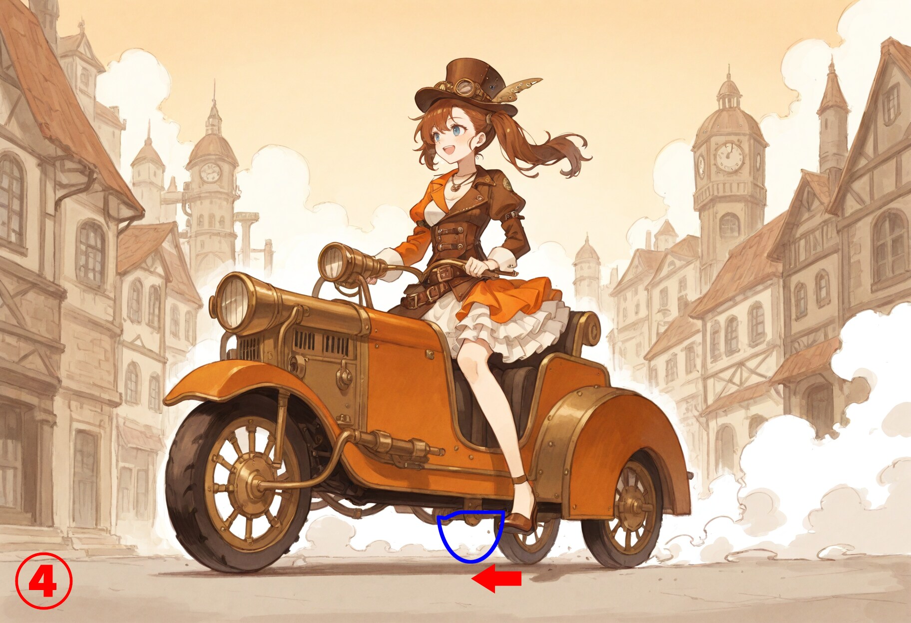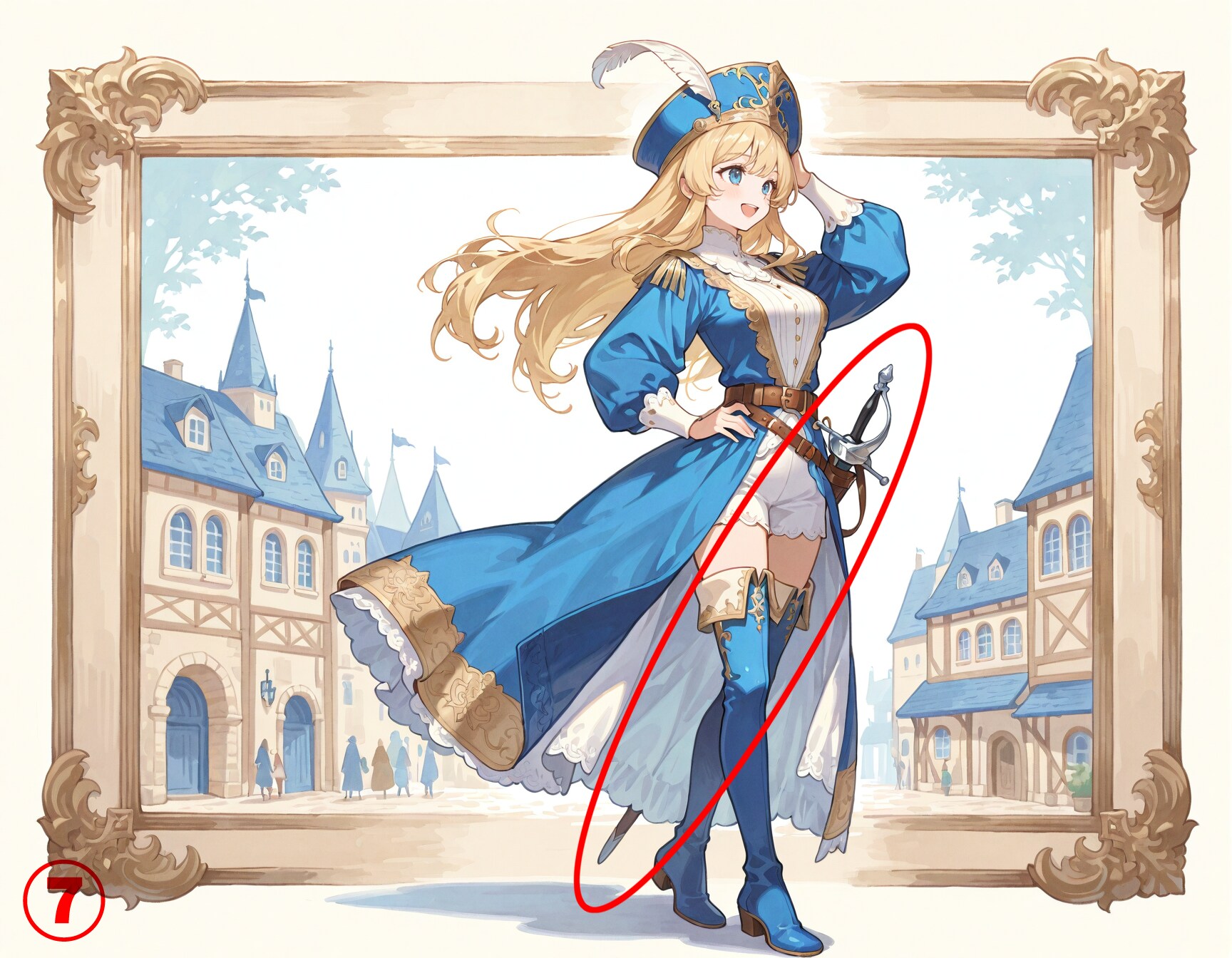 🔍【完成イラストで気になるところ】 ※あくまで私が個人的に気になる点です ①剣が身体の後ろを通ってずれてしまう ・わりとよくある左右のズレ →後ろの手すりなどが大きくズレていて修正が困難な場合は諦めます これくらいであれば剣を切り取って上にずらして修正したりします ②微妙にわかりにくい身体の違和感 ・右足の太ももが左足の後ろで少しずれてしまっています →簡単に直せそうですが、意外に大変でだいたい諦めています ・身体の奥にある右手がカフスの位置からとんでもなく遠くに出てしまっています →この場合は右手の指を消します ③右足のふくらはぎがとんでもなく太い ・赤丸の部分と反対側が両方見えていてふくらはぎがとんでもなく太く見えます →赤丸部分か、太ももの上部分のどちらかを消しますが、だいたい上手くいかずに作り直しに・・・ ④右後輪の位置 ・乗り物あるあるですが、タイヤの位置がちょっと後ろ過ぎな感じです (※右後輪も左と同じように張り出していると仮定しています →修正出来そうなら少し前に移動します ⑤シチュエーション的に気になる ・城内をのんびり歩いていて戦闘状態では無いのに抜刀しているのが気になります →レイピアを鞘に入れて腰に吊っている状態で作り直します ⑥⑦どちらも単体で見ればそれほど変では無いけど・・・ ・同じ格好の同一人物という設定なので、持っているレイピアの長さが違うのが気になります →正直、これはそこまで気にしなくても良いかな~とは思いますが・・・ ⑧よく見ると視線がおかしい ・女の子が小さい子に風船をあげているシーンに見えますが、よく見ると視線が合っていません →投稿してからなんか違和感あるなぁと思っていて気づきました (※投稿から時間が経ってしまったので削除せずそのままにしてあります ⑨脚の太さや長さに違和感があるけど・・・ ・これは脚が細いし長すぎるけど、絵として迫力があるのでそのまま使います →⑧くらいの長さにするとだいぶ迫力が無くなってしまうと思います 🧠【後記】 普段、完成イラストをチェックする際に気になりそうなポイントをいくつか挙げてみました 簡単に直せそうな所はPhotoshopなどで直しますが、ボツにして作り直すことも多いですね # Model: shiitakeMix v2.0 by Vsukiyaki