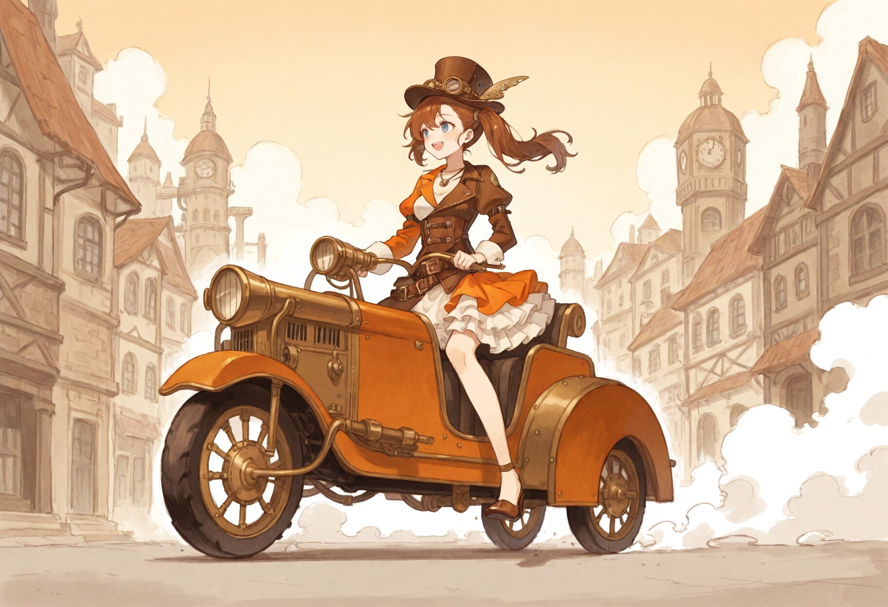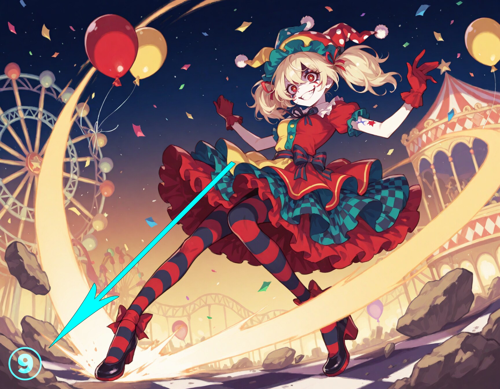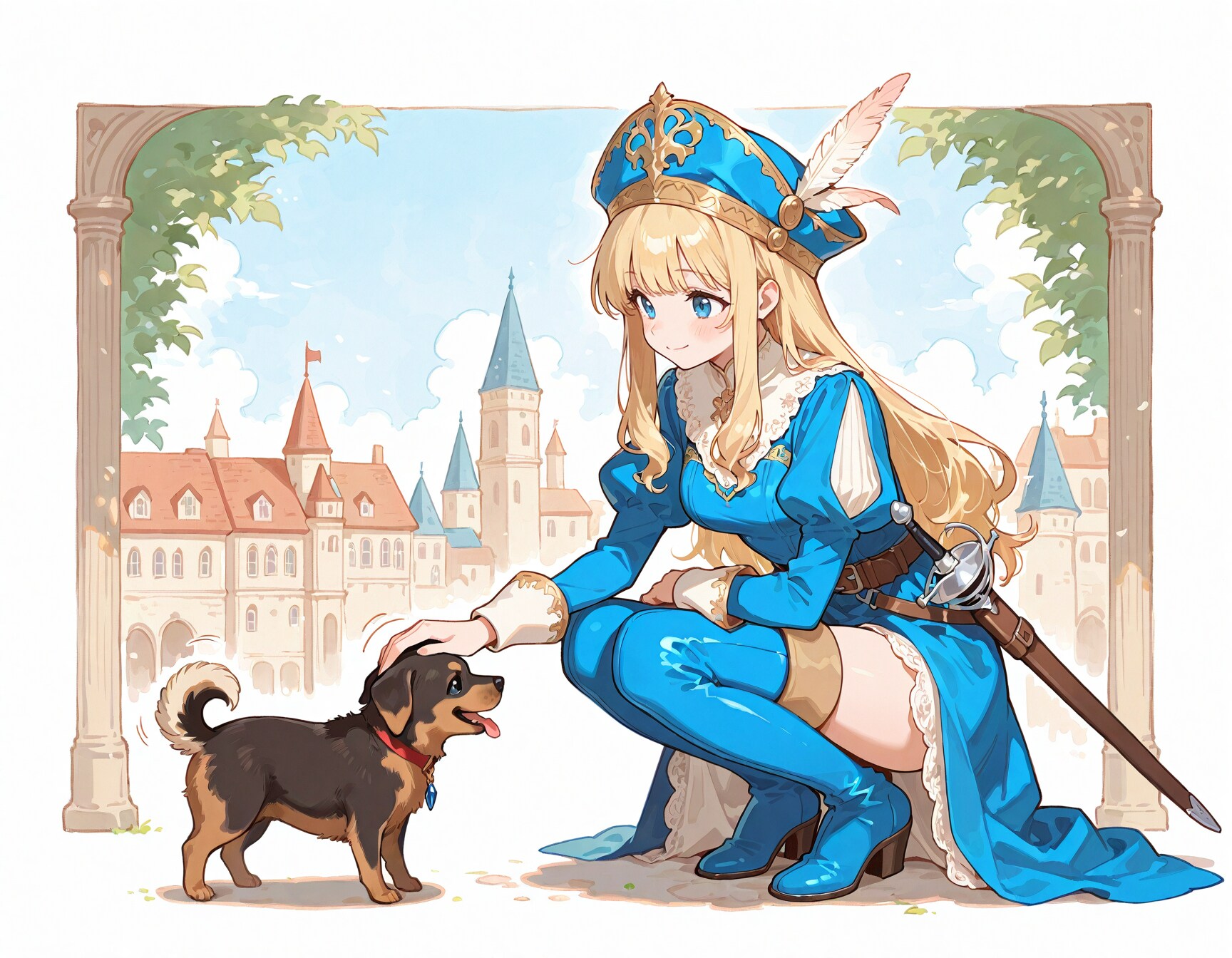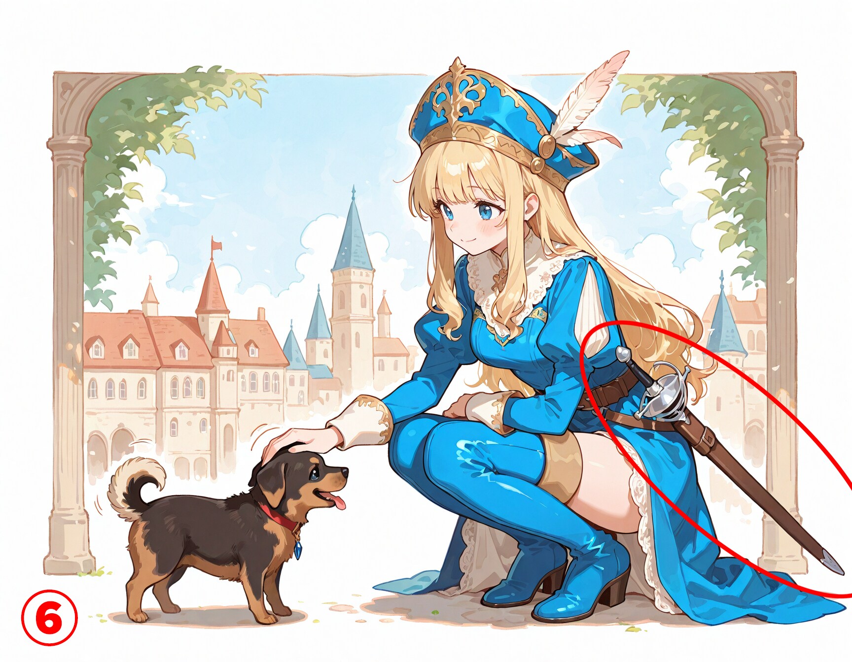 🔍【完成イラストで気になるところ】 ※あくまで私が個人的に気になる点です ①剣が身体の後ろを通ってずれてしまう ・わりとよくある左右のズレ →後ろの手すりなどが大きくズレていて修正が困難な場合は諦めます これくらいであれば剣を切り取って上にずらして修正したりします ②微妙にわかりにくい身体の違和感 ・右足の太ももが左足の後ろで少しずれてしまっています →簡単に直せそうですが、意外に大変でだいたい諦めています ・身体の奥にある右手がカフスの位置からとんでもなく遠くに出てしまっています →この場合は右手の指を消します ③右足のふくらはぎがとんでもなく太い ・赤丸の部分と反対側が両方見えていてふくらはぎがとんでもなく太く見えます →赤丸部分か、太ももの上部分のどちらかを消しますが、だいたい上手くいかずに作り直しに・・・ ④右後輪の位置 ・乗り物あるあるですが、タイヤの位置がちょっと後ろ過ぎな感じです (※右後輪も左と同じように張り出していると仮定しています →修正出来そうなら少し前に移動します ⑤シチュエーション的に気になる ・城内をのんびり歩いていて戦闘状態では無いのに抜刀しているのが気になります →レイピアを鞘に入れて腰に吊っている状態で作り直します ⑥⑦どちらも単体で見ればそれほど変では無いけど・・・ ・同じ格好の同一人物という設定なので、持っているレイピアの長さが違うのが気になります →正直、これはそこまで気にしなくても良いかな~とは思いますが・・・ ⑧よく見ると視線がおかしい ・女の子が小さい子に風船をあげているシーンに見えますが、よく見ると視線が合っていません →投稿してからなんか違和感あるなぁと思っていて気づきました (※投稿から時間が経ってしまったので削除せずそのままにしてあります ⑨脚の太さや長さに違和感があるけど・・・ ・これは脚が細いし長すぎるけど、絵として迫力があるのでそのまま使います →⑧くらいの長さにするとだいぶ迫力が無くなってしまうと思います 🧠【後記】 普段、完成イラストをチェックする際に気になりそうなポイントをいくつか挙げてみました 簡単に直せそうな所はPhotoshopなどで直しますが、ボツにして作り直すことも多いですね # Model: shiitakeMix v2.0 by Vsukiyaki