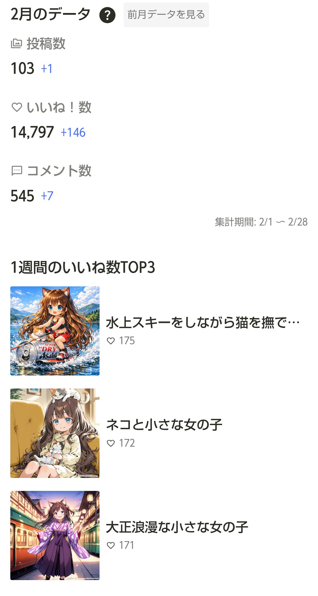 1月は多く投稿できました。1か月で15000いいねを超えたのは初めてです そして1週間のベスト3にスーパードライ入れずw こなつちゃんはやはり愛されてますね 全年齢で100いいねを超えなかったのは5件 200いいねを超える投稿は3件 ・旅館で寝過ごした小さな女の子 https://www.chichi-pui.com/posts/dc6a98ad-6d79-4539-a198-f2ffd13c79c1/ ・ゴシックな小さな女の子 https://www.chichi-pui.com/posts/b6c553e5-6aa8-43b8-ad53-72a38f49ffaf/ ・ネコもしたたる小さな女の子 https://www.chichi-pui.com/posts/0e368eca-d305-4c7b-b01c-a71884ba3093/