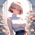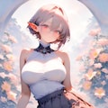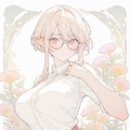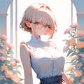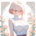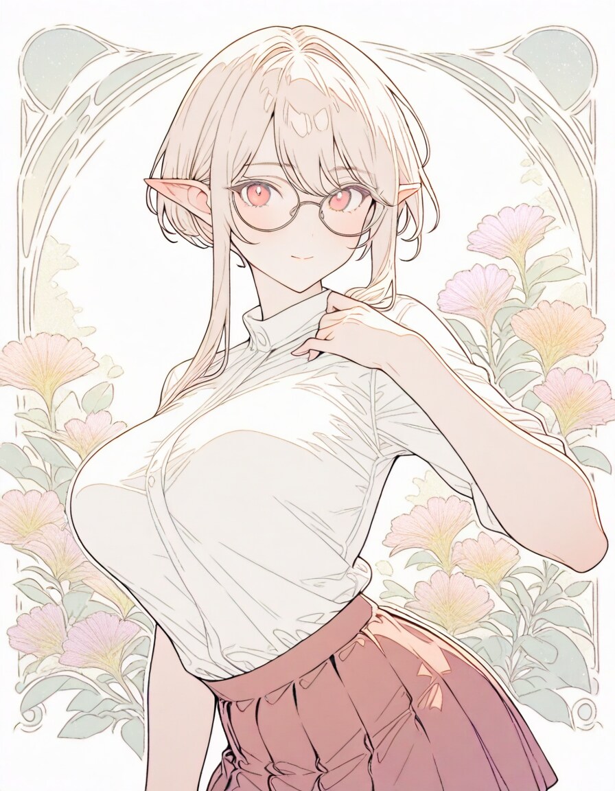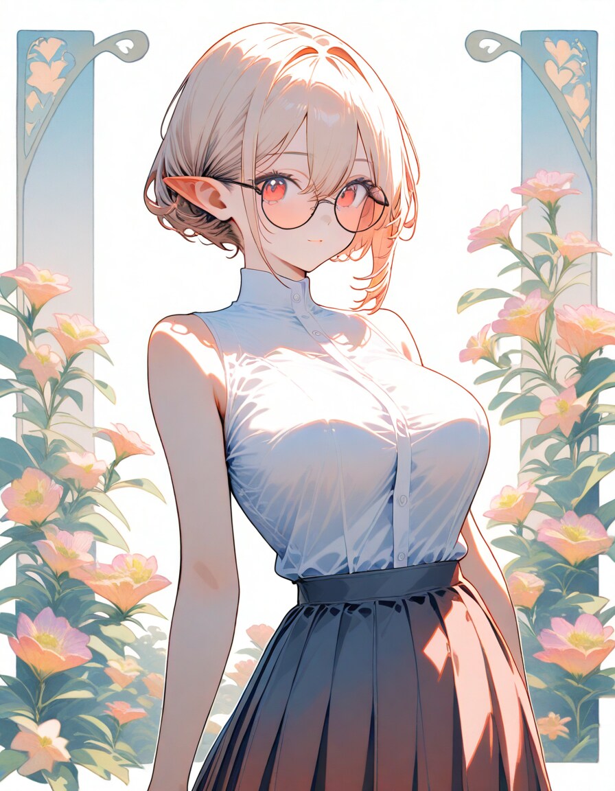 1girl, _ , from _ , pale pink blonde hair, very short hair, long sidelocks, hair between eyes, red eyes, round glasses, pointy ears, large breast, high neck no sleeve white blouse, short red skirt, pleated skirt, contrapposto, white background, wind browing, day light, contrapposto, white background, iridescent flower, gradient flower, lots of flowers, japonica, art nouveau, BREAK (masterpiece, best quality, high score, great score, year 2024, ultra-detailed anime-style high resolution 3dcg:1.0), intricate details whitish color line art, light diffusion, vintage retro muted colors, light color, Low Saturation pastel colors, (Matte flat color simple shapes, gradiation:0.8), (hyper-realistic, Sleek design:0.6)
