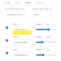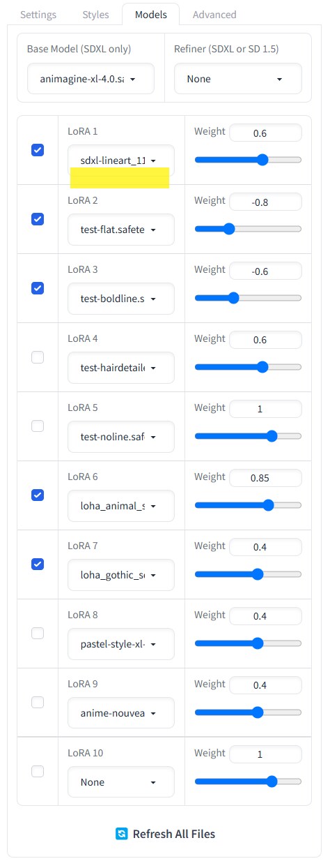 2枚目:Fooocusだと「Models」タブからLoRAを複数指定できるので、そこで指定しています。
