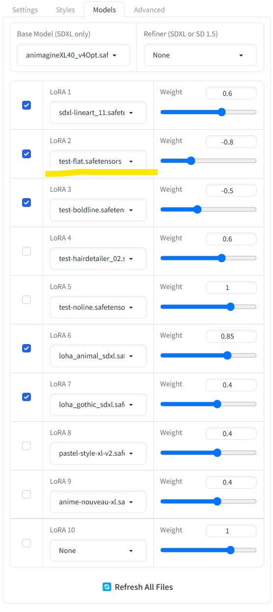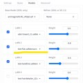 2枚目:Fooocusだと「Models」タブからLoRAを複数指定できるので、そこで指定しています。