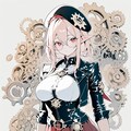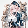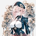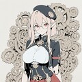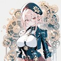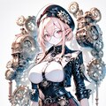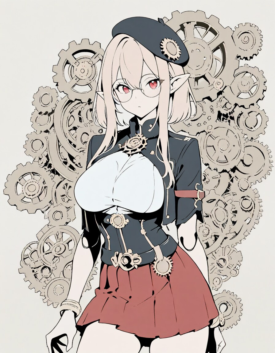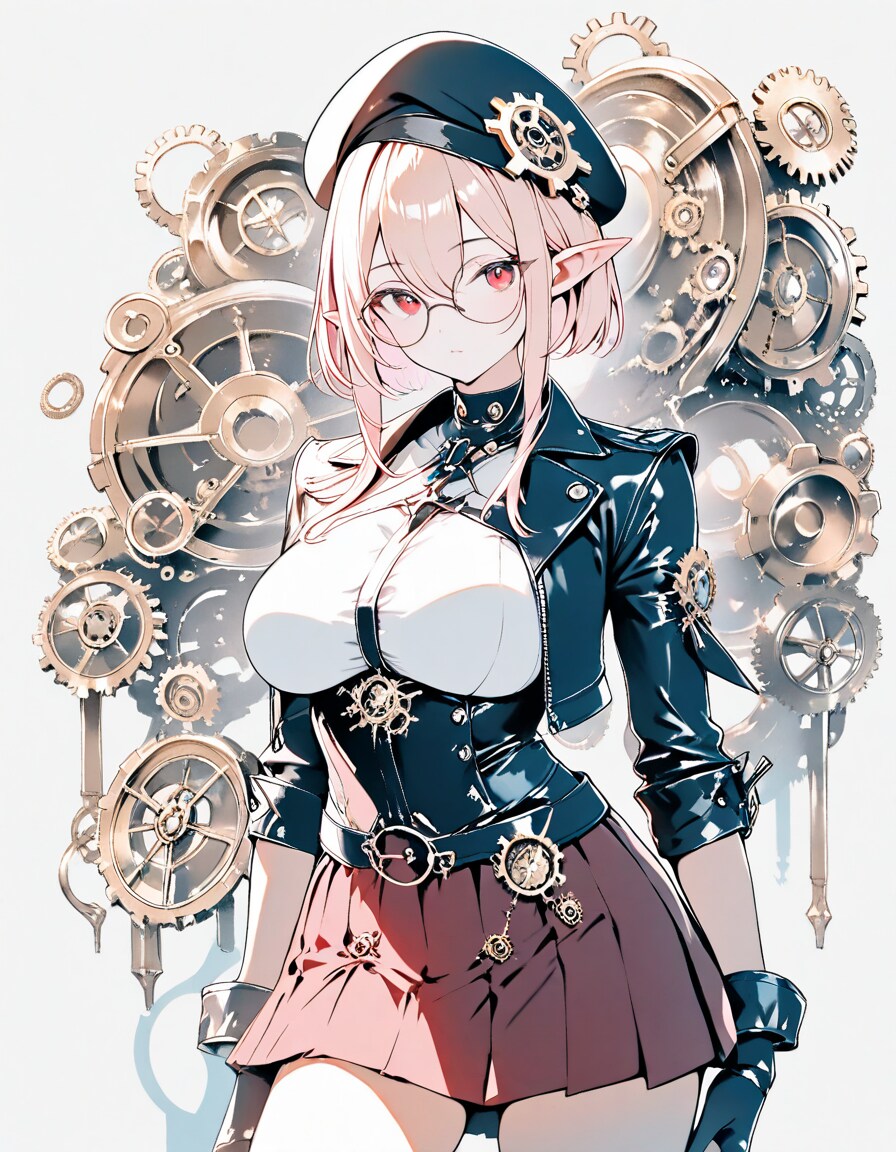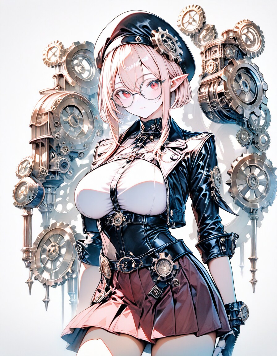 1girl, _ , from _ , pale pink blonde hair, very short hair, long sidelocks, hair between eyes, red eyes, round glasses, pointy ears, large breast, high neck no sleeve steampunk style leather jacket, Gear ornament, beret, short red skirt, pleated skirt, contrapposto, Complex machinery, lots of gears, lots of joints, steampunk style background, thick fog around, BREAK masterpiece, best quality, high score, great score, ultra-detailed high resolution (anime-style 3dcg:1.0), intricate details light color, whitish color line art, light diffusion, muted color, Matte flat color, watercolor gradiation, hyper-realistic, Sleek design