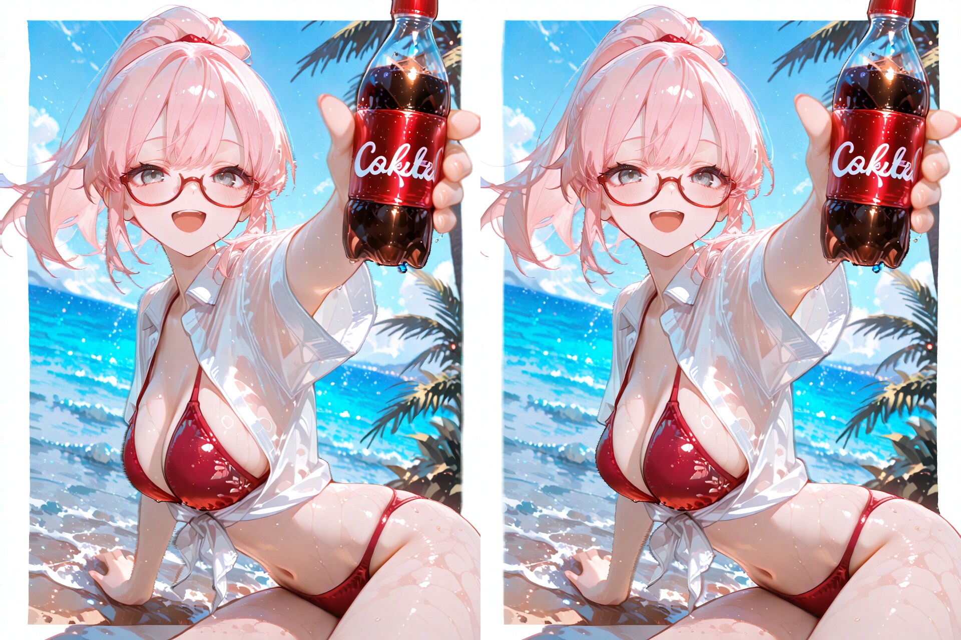 red bikini, white collared shirt, tied shirt,