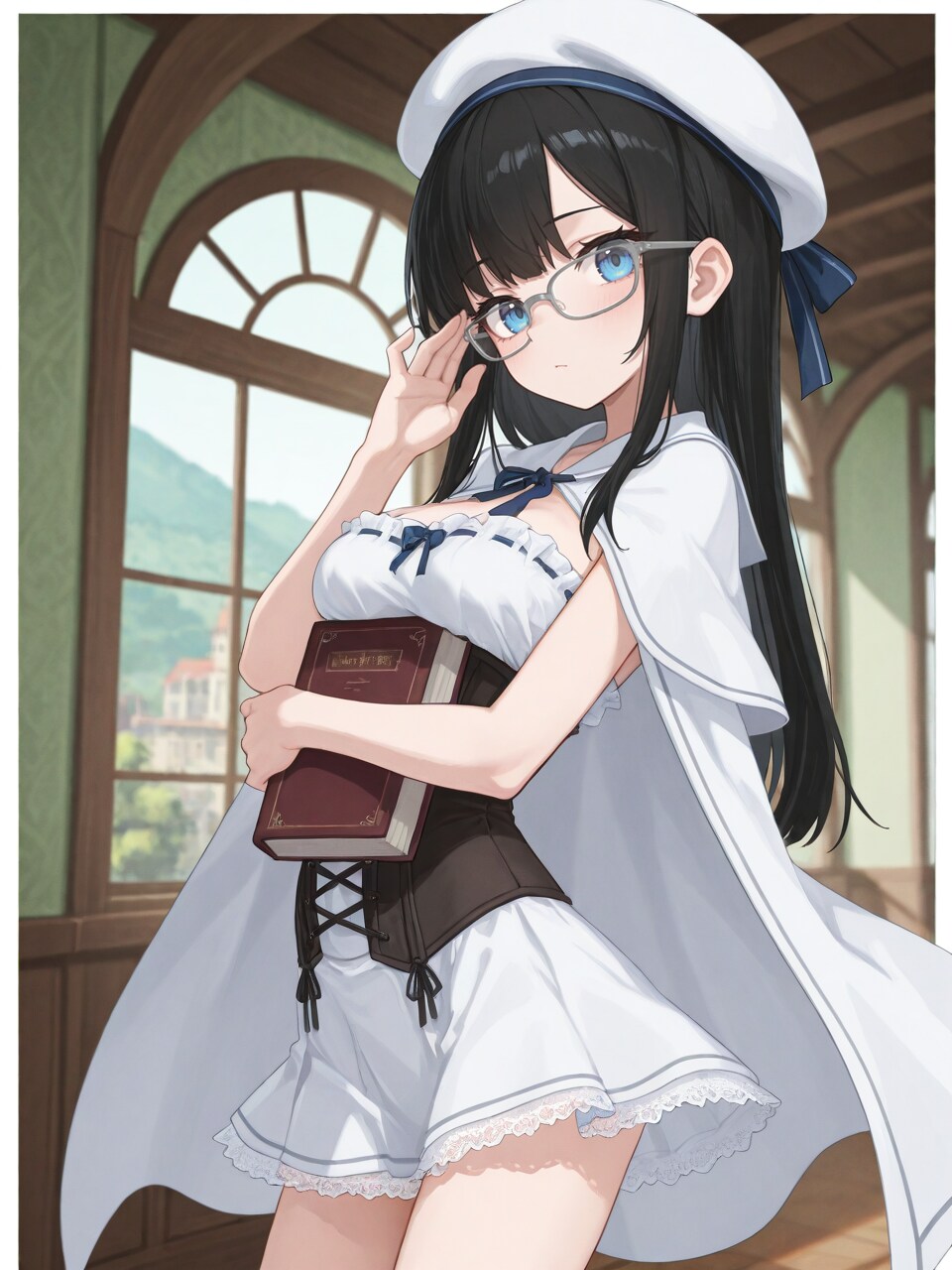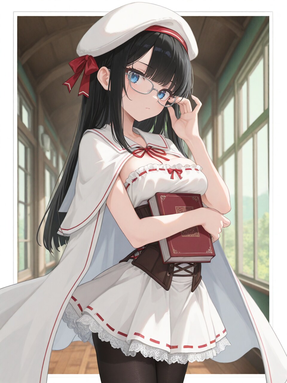 indoors, fantasy, (school, hallway, wooden architecture, window, landscape:0.9),