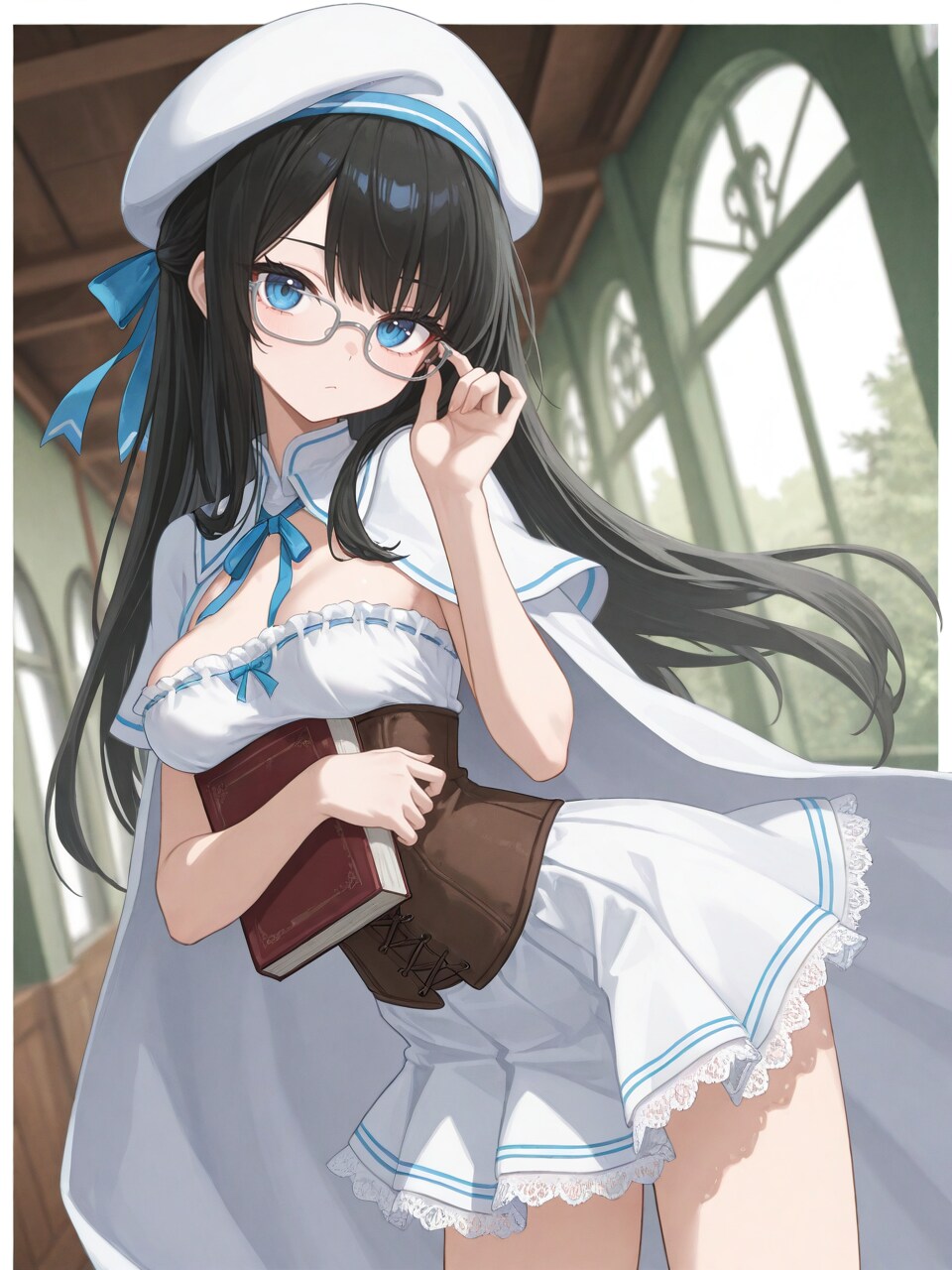 arm under breasts, adjusting eyewear, (hugging book:1.1), arched back