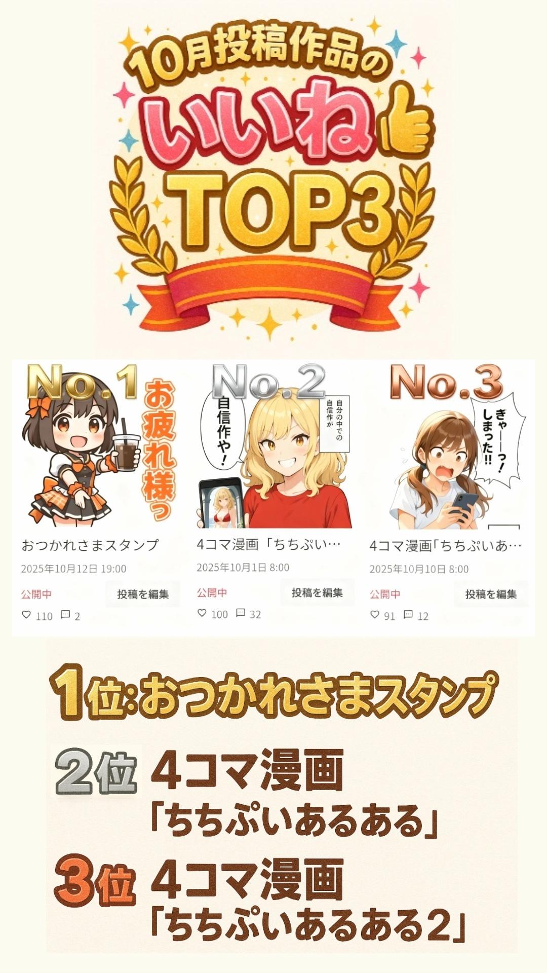 2枚目は前月の実績、3枚目はおまけです() 以下、詳しい実績(執筆中) 100♥️ or more おつかれさまスタンプ(1位) ♥️110 https://www.chichi-pui.com/posts/5ceaa417-6c4f-4e65-a32c-565f38dbef64/ 4コマ漫画「ちちぷいあるある」(2位) ♥️100 https://www.chichi-pui.com/posts/91ce31f7-9c3a-4057-9f27-2430bc8a49aa/ 50♥️ or more RANKING🏆(デイリー呪文ありorなしのみ)