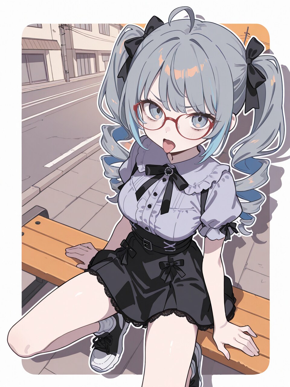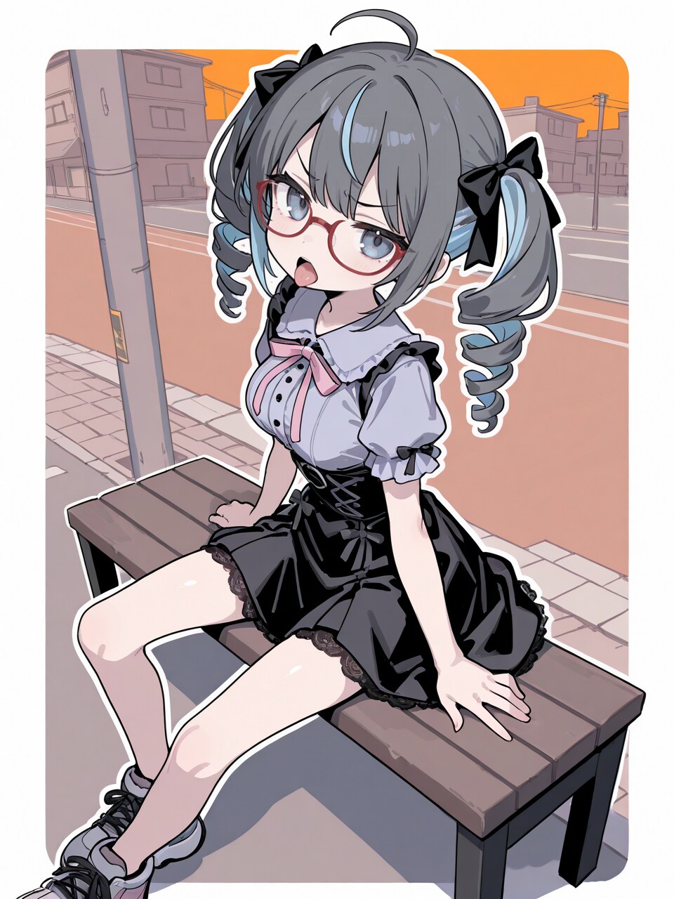 outdoors, street, on bench, (building, utility pole, power lines:0.8),