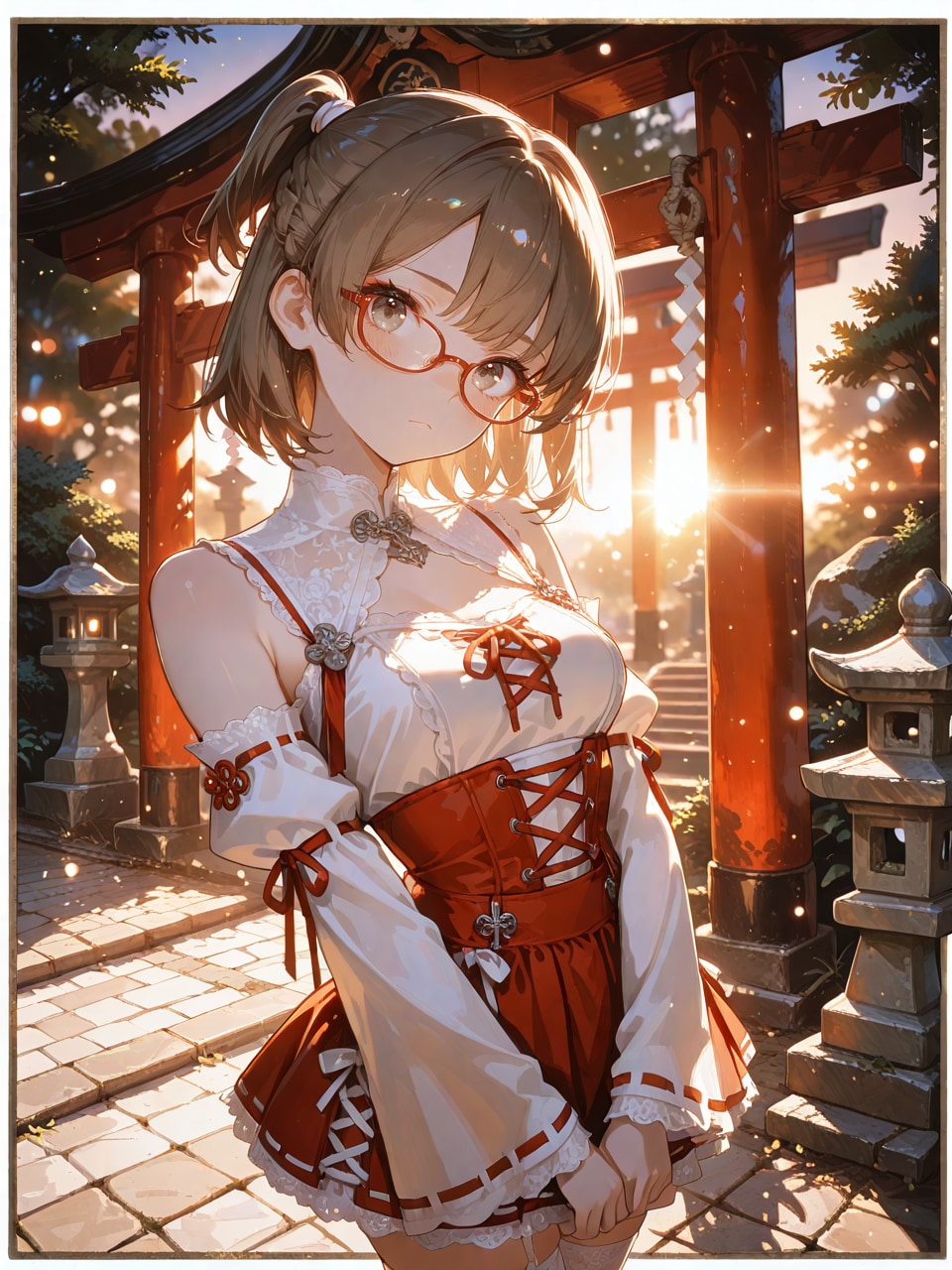 outdoors, dusk, sunset, shrine, (torii:0.8), stone path, (plant background, tree:0.8),
