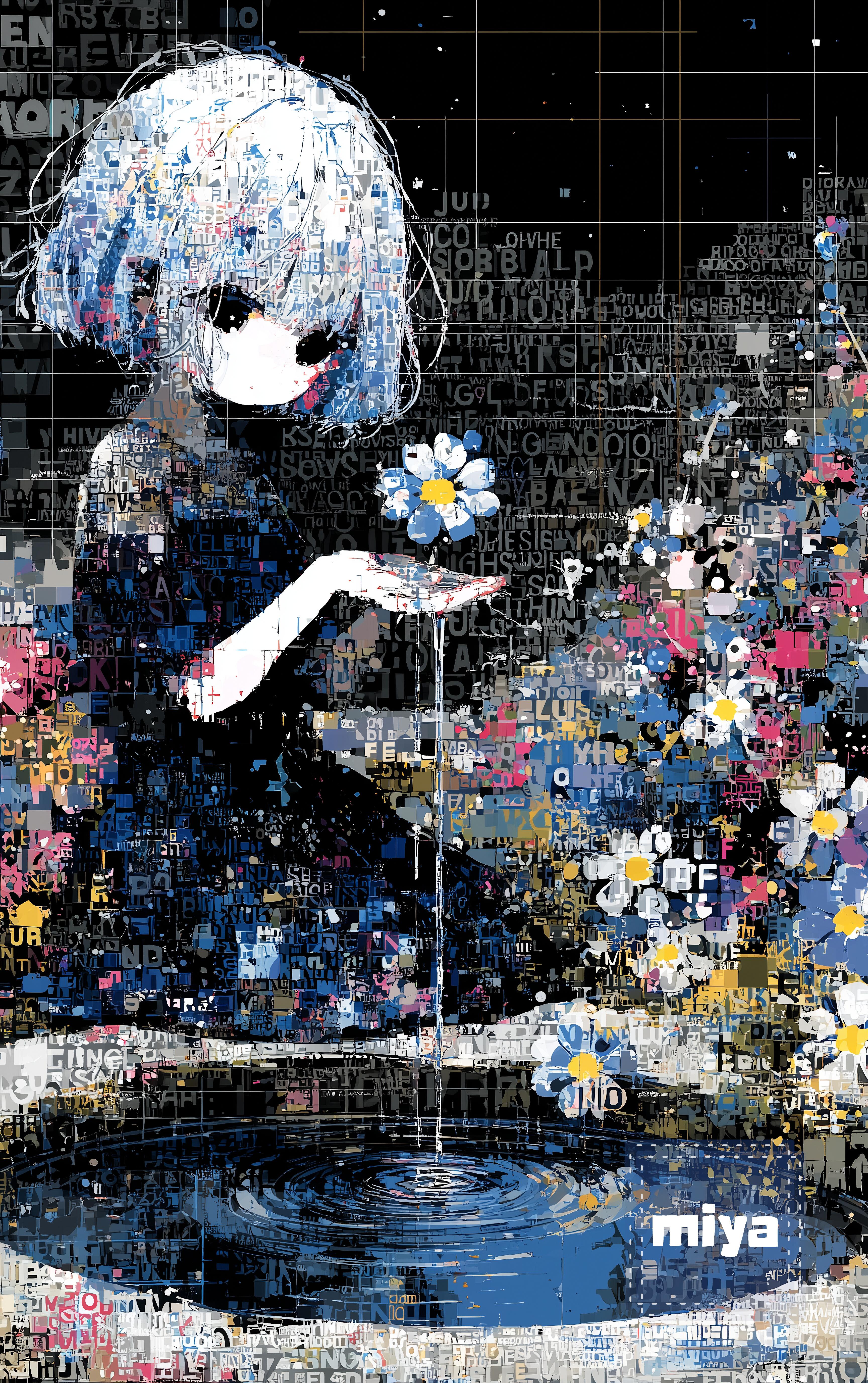 Beautiful summer lake scenery with a profusion of vibrant forget-me-nots in full bloom. The little slime girl sits and scoops water and petal from the fountain of words into the palm of her hand. city twilight in water, water's surface made entirely of small lots of large and small letters in decorative fonts, layers upon layers, melting long blue slime hair, suntan scared liquid body, pleated skirt, smooth marbling, limited palette, meaningless real world, dynamic angles from oblique side, picture book style moe anime, golden drizzle, ephemeral atmosphere --v 7.0 --raw --p xd97txk --sref 1970097021::1 3161817471::1 3604182537::3 568688171::5 3544290919::1 3710016932::1 2494083273::6 3717843000::2 1702533951::2 602153393::3 2220609054::3 418458060::2 2895306335::2 --sv 4 --sw 150 --exp 25 --ar 5:8 --s 400