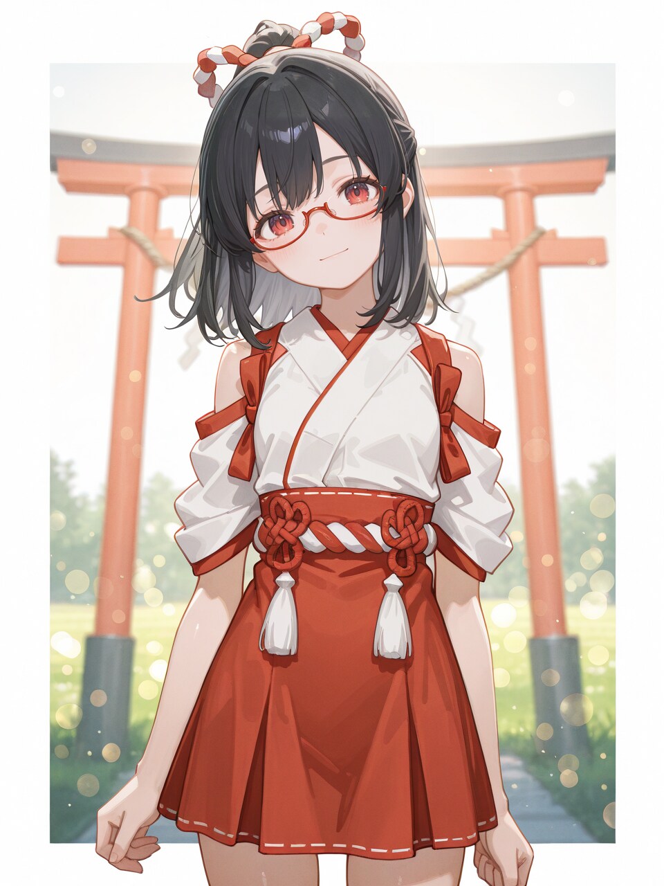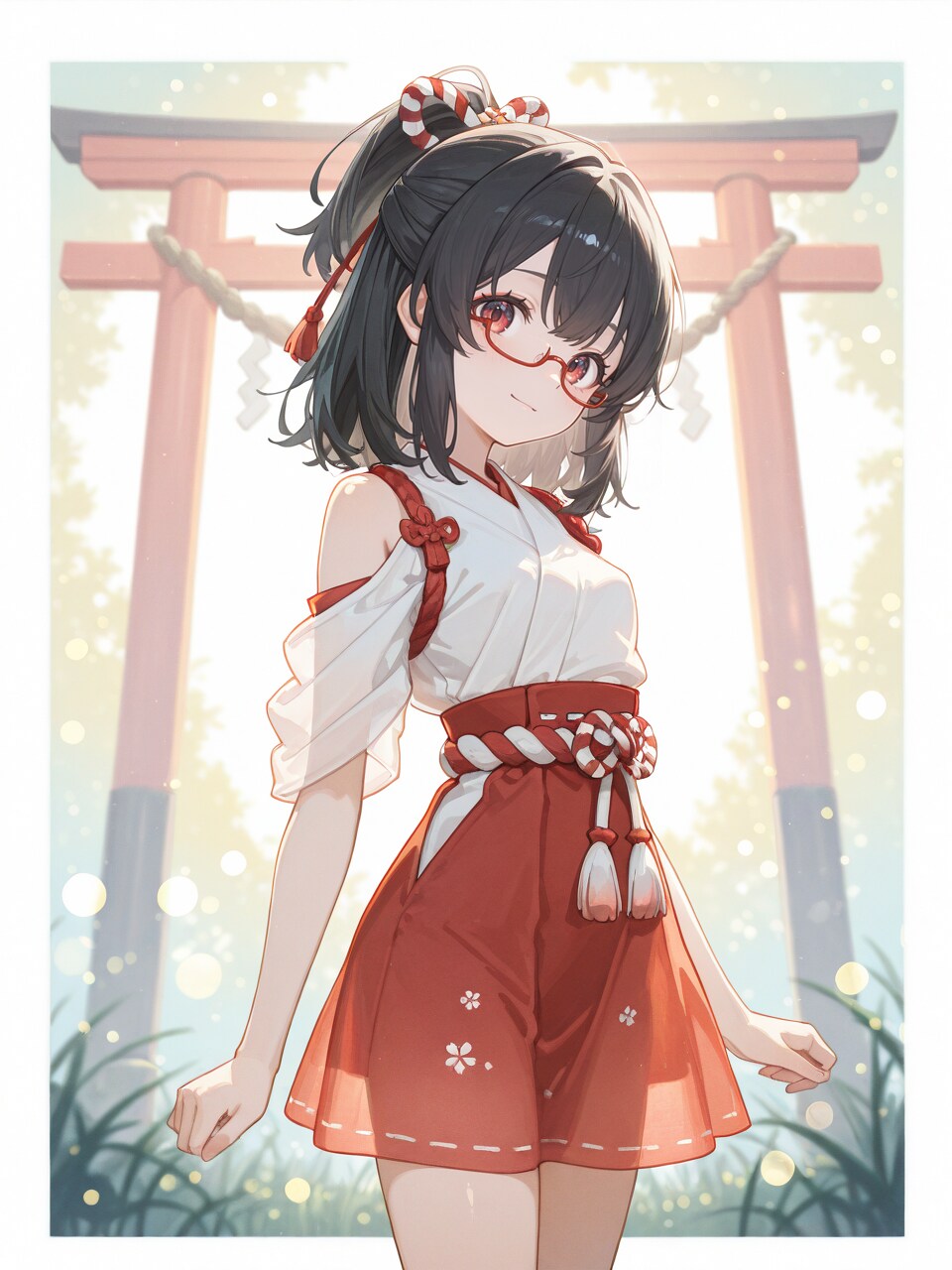 outdoors, (grasslands, plant, jinja, torii:0.8), shimenawa,