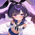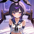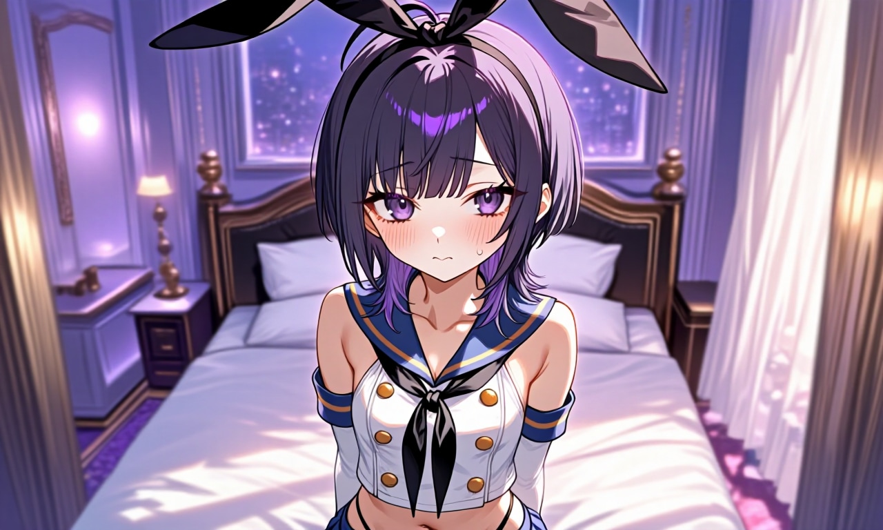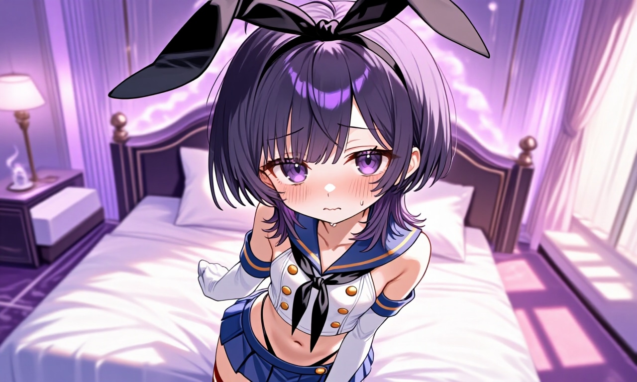 Black bunny ears. Blue miniskirt. Sailor collar top. Black ribbon. Black micro shorts.White long gloves.
