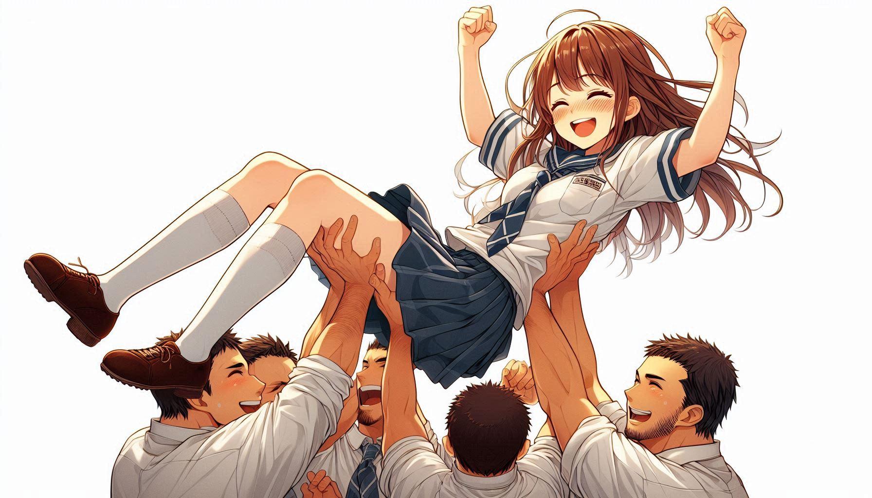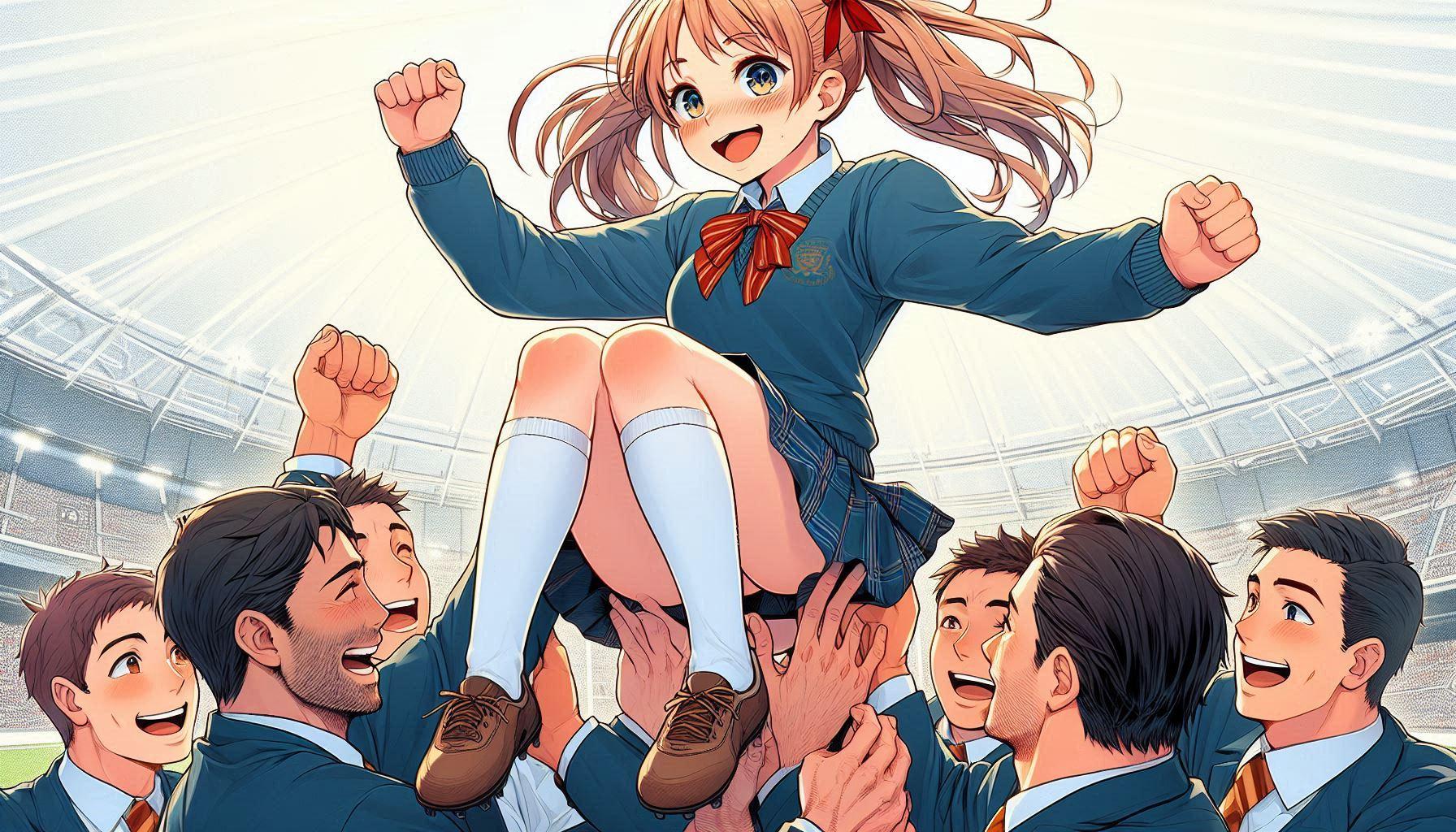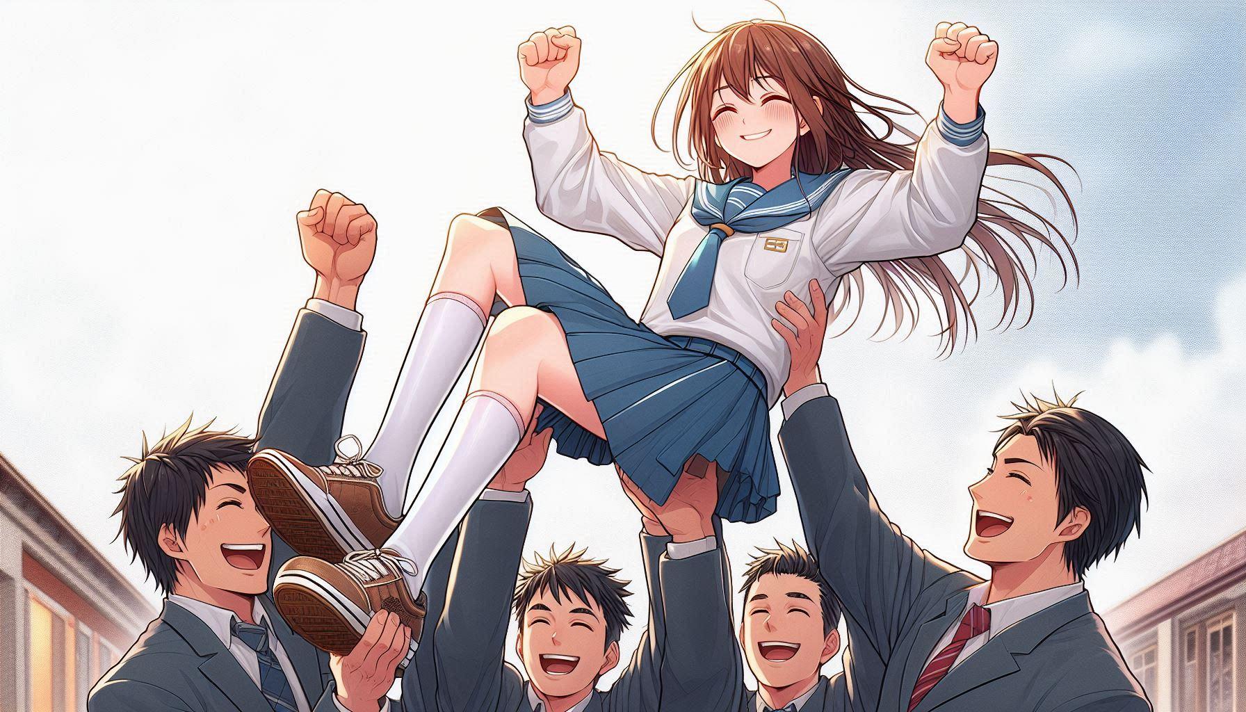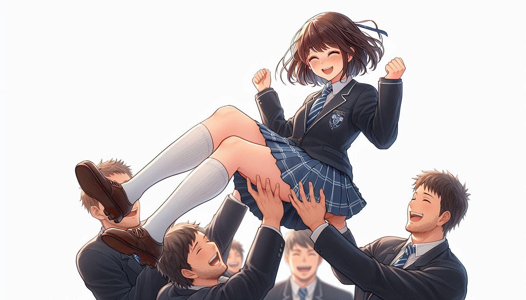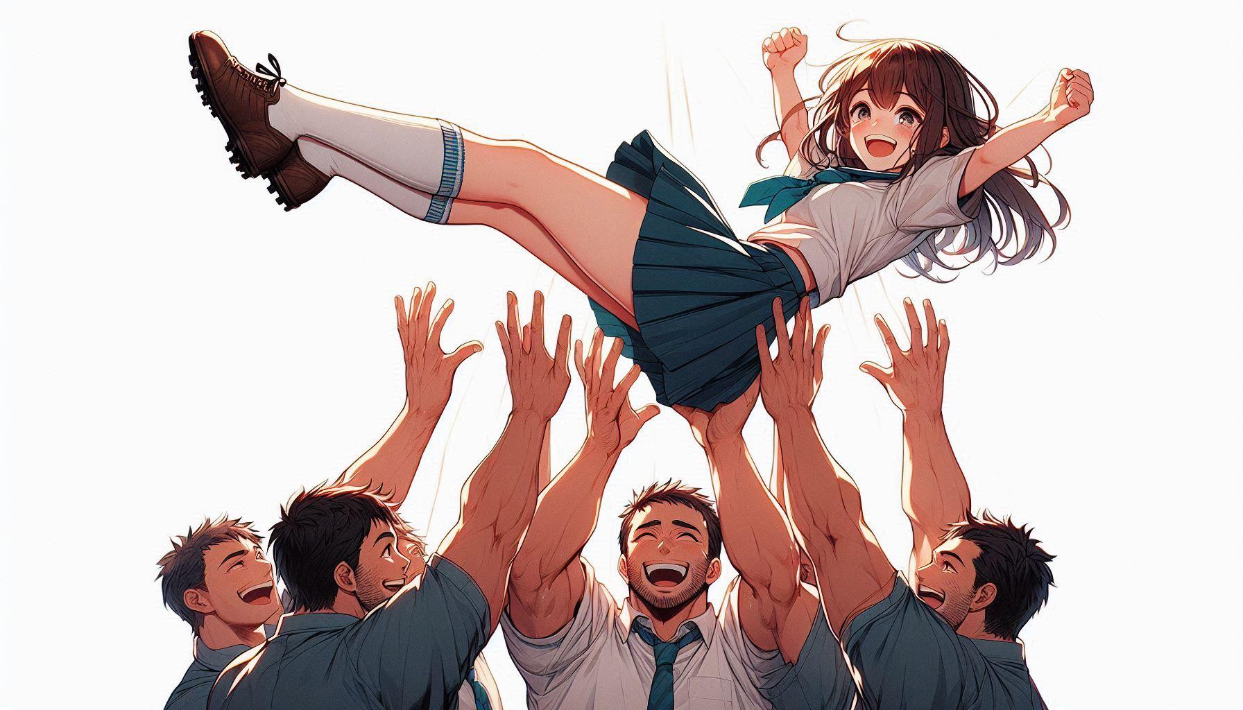 胴上げされる学生服の笑顔の女の子。受験に合格した。男子ラグビー部の集団に胴上げされている。アニメ風のイラスト。カラーイラスト。ダイナミックな構図で。白い靴下。スカートがひるがえる。