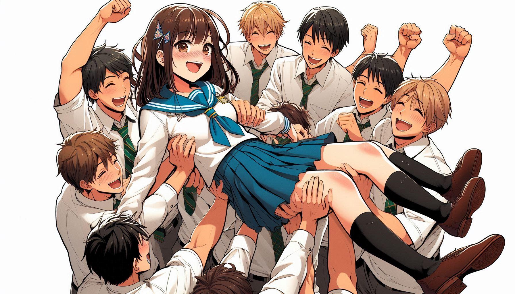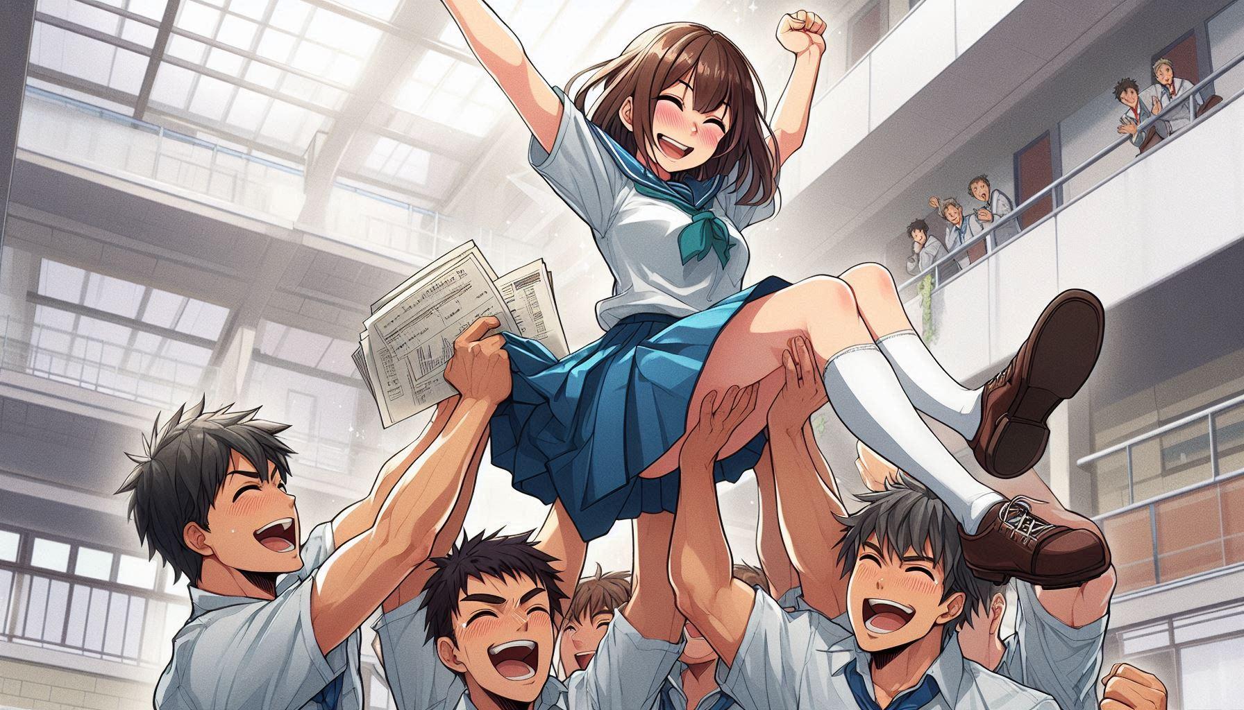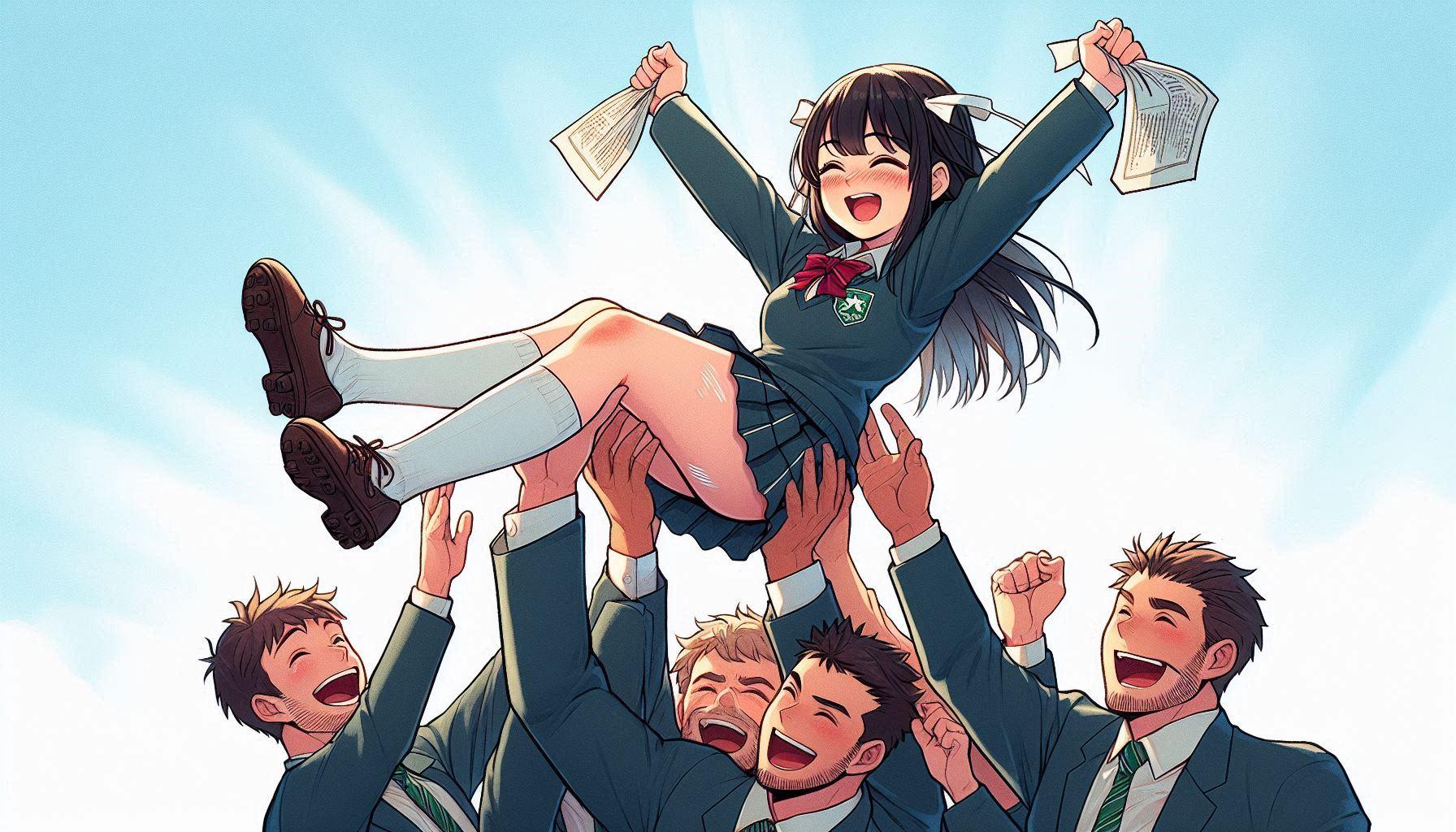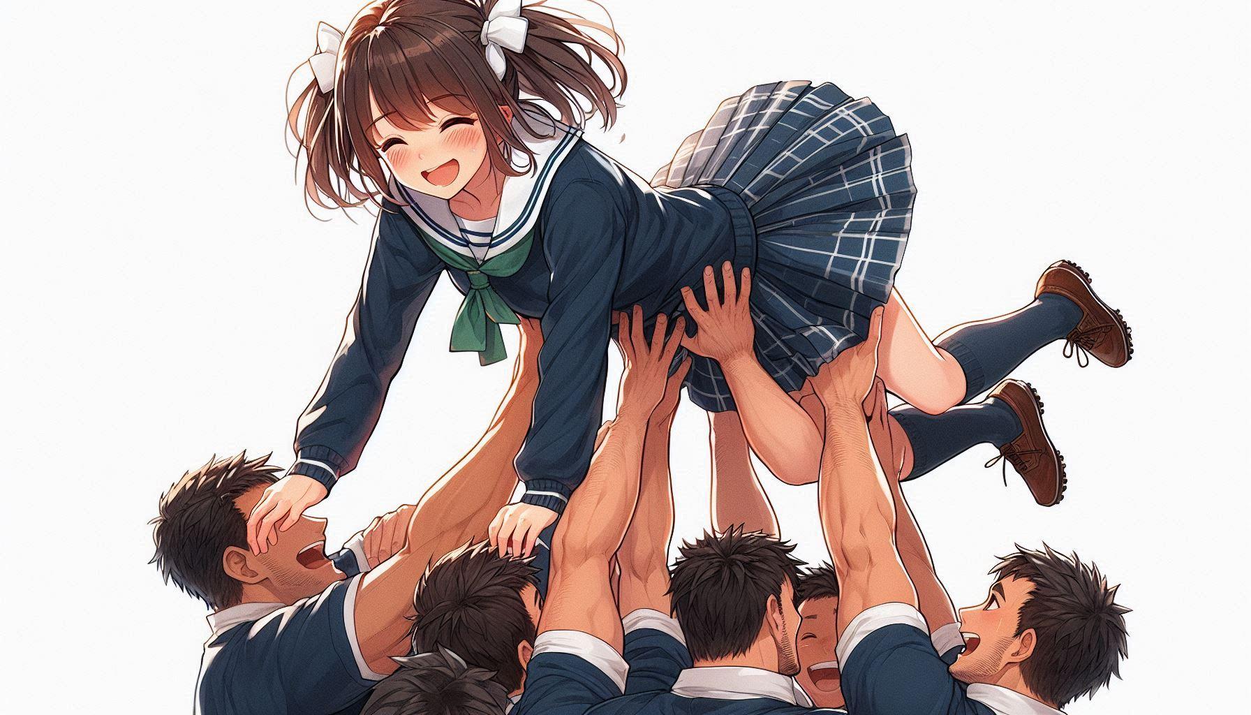 胴上げされる学生服の笑顔の女の子。受験に合格した。男子ラグビー部の集団に胴上げされている。アニメ風のイラスト。カラーイラスト。ダイナミックな構図で。白い靴下。スカートがひるがえる。