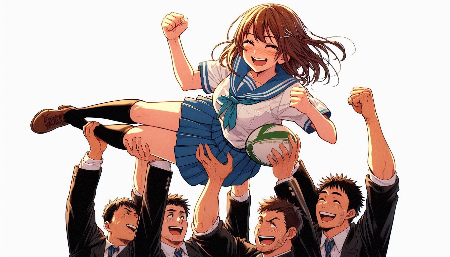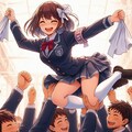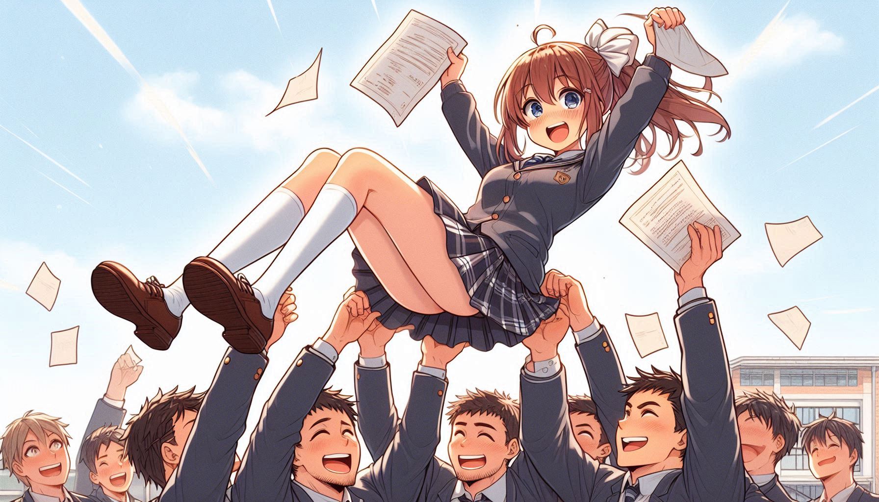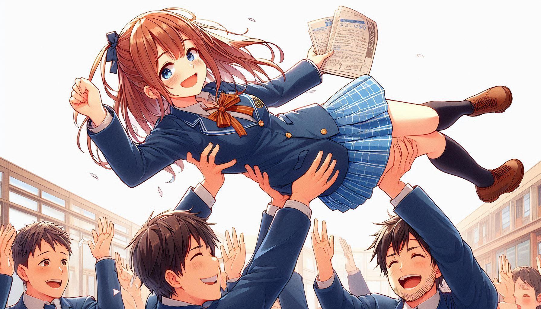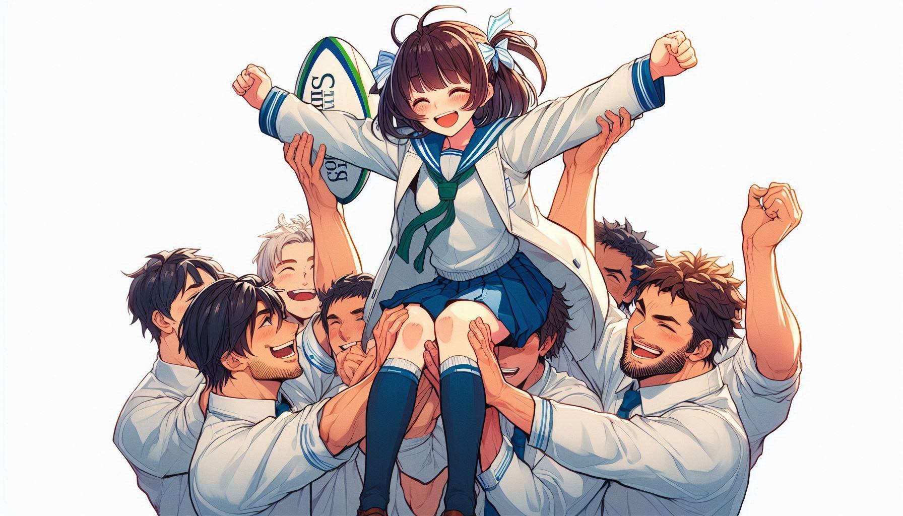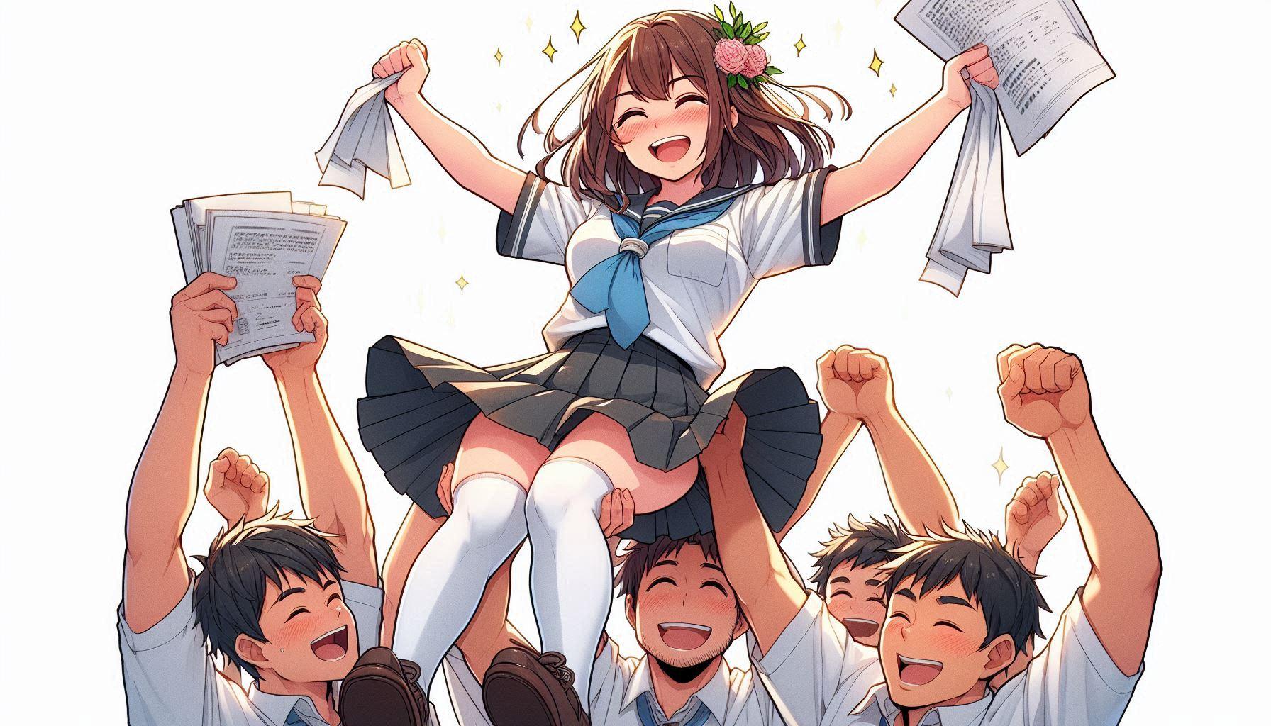 胴上げされる学生服の笑顔の女の子。受験に合格した。男子ラグビー部の集団に胴上げされている。アニメ風のイラスト。カラーイラスト。ダイナミックな構図で。白い靴下。スカートがひるがえる。
