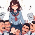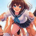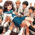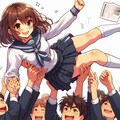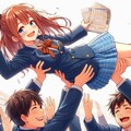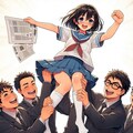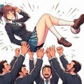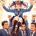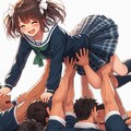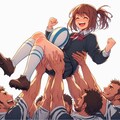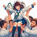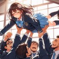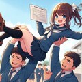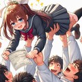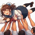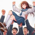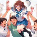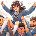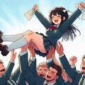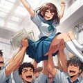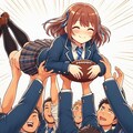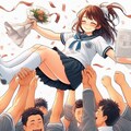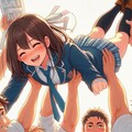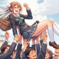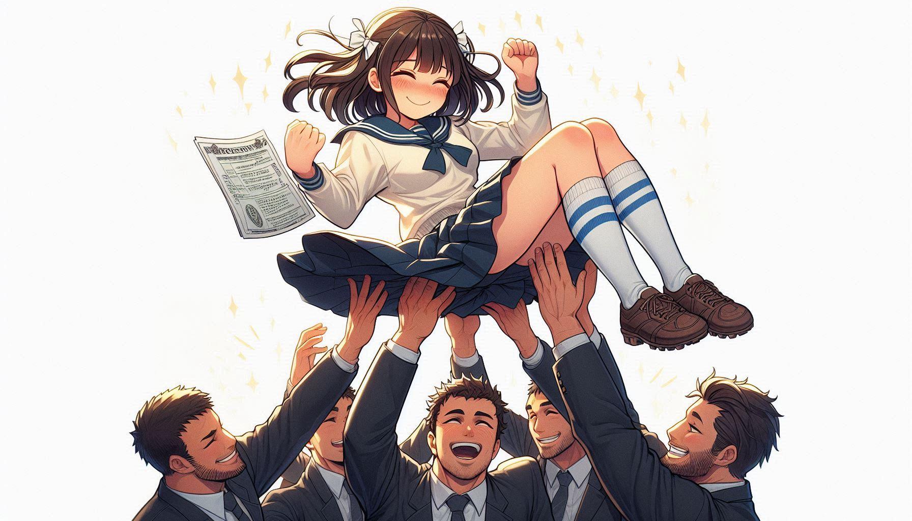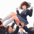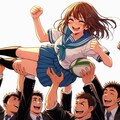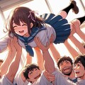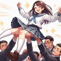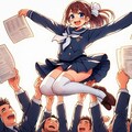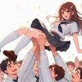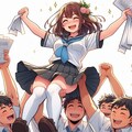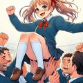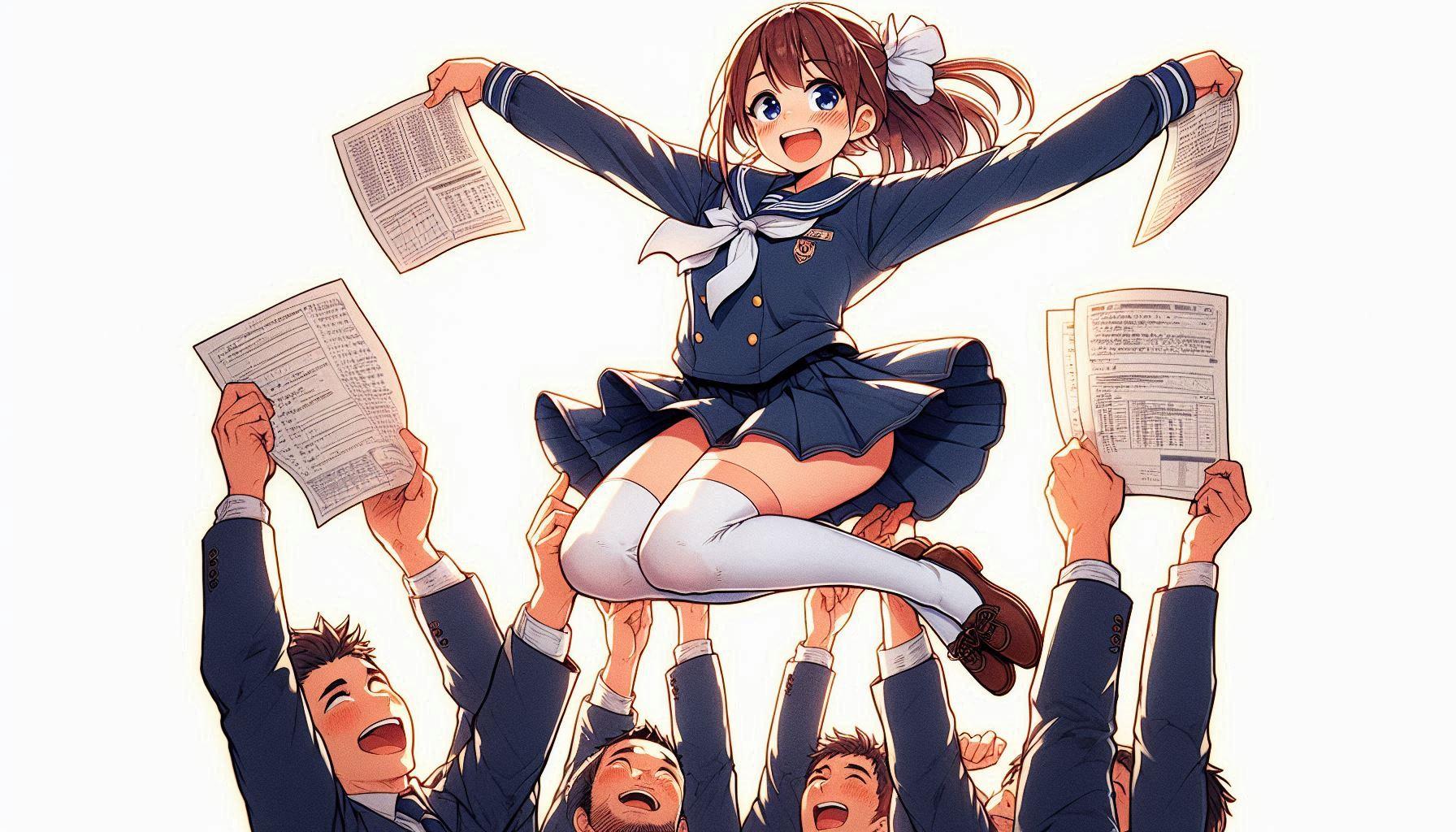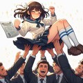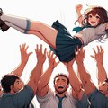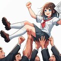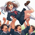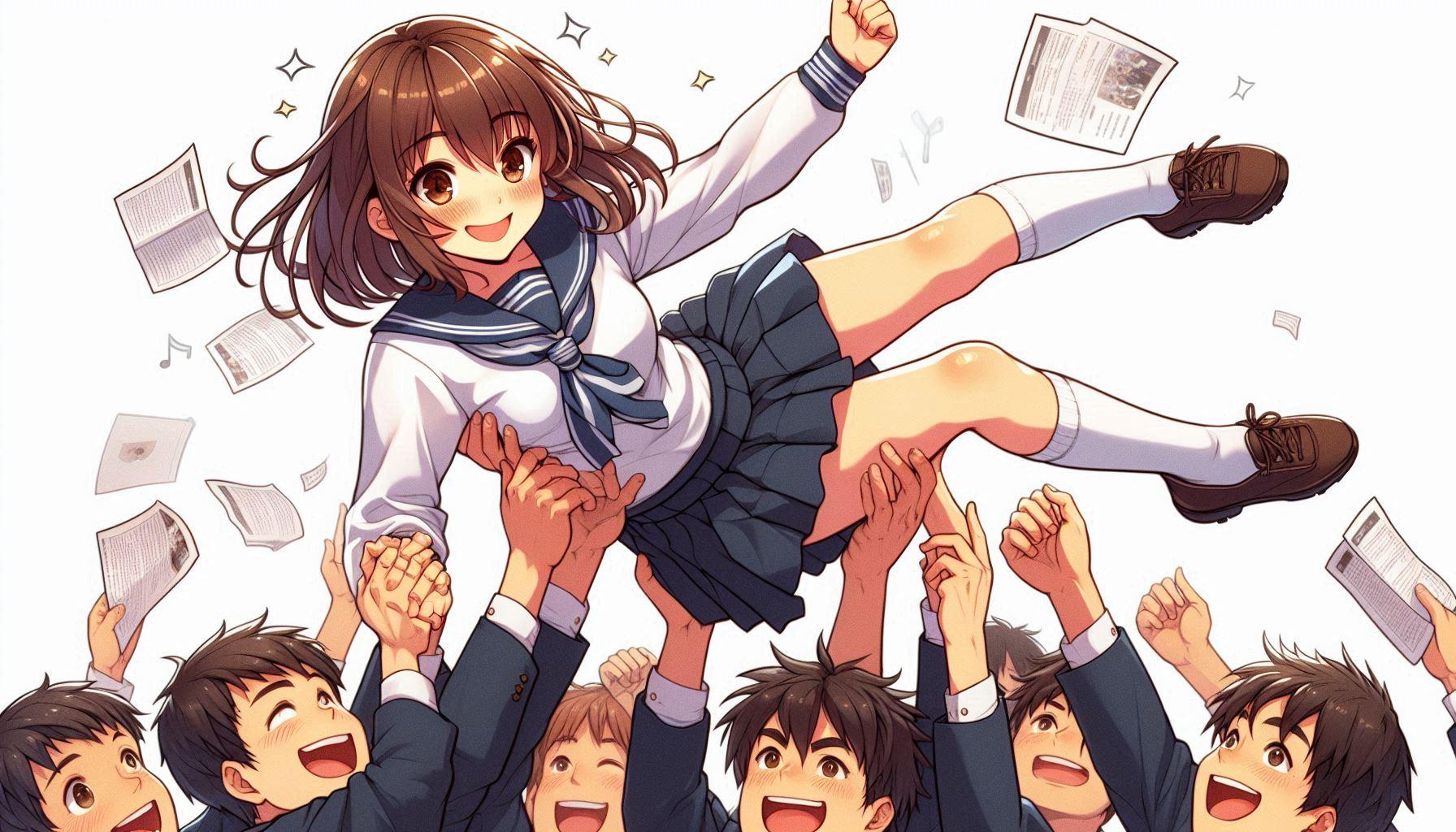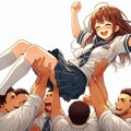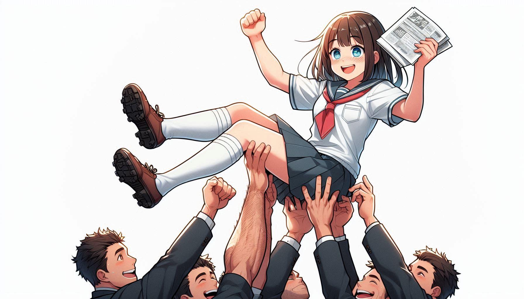 胴上げされる学生服の笑顔の女の子。受験に合格した。男子ラグビー部の集団に胴上げされている。アニメ風のイラスト。カラーイラスト。ダイナミックな構図で。白い靴下。スカートがひるがえる。