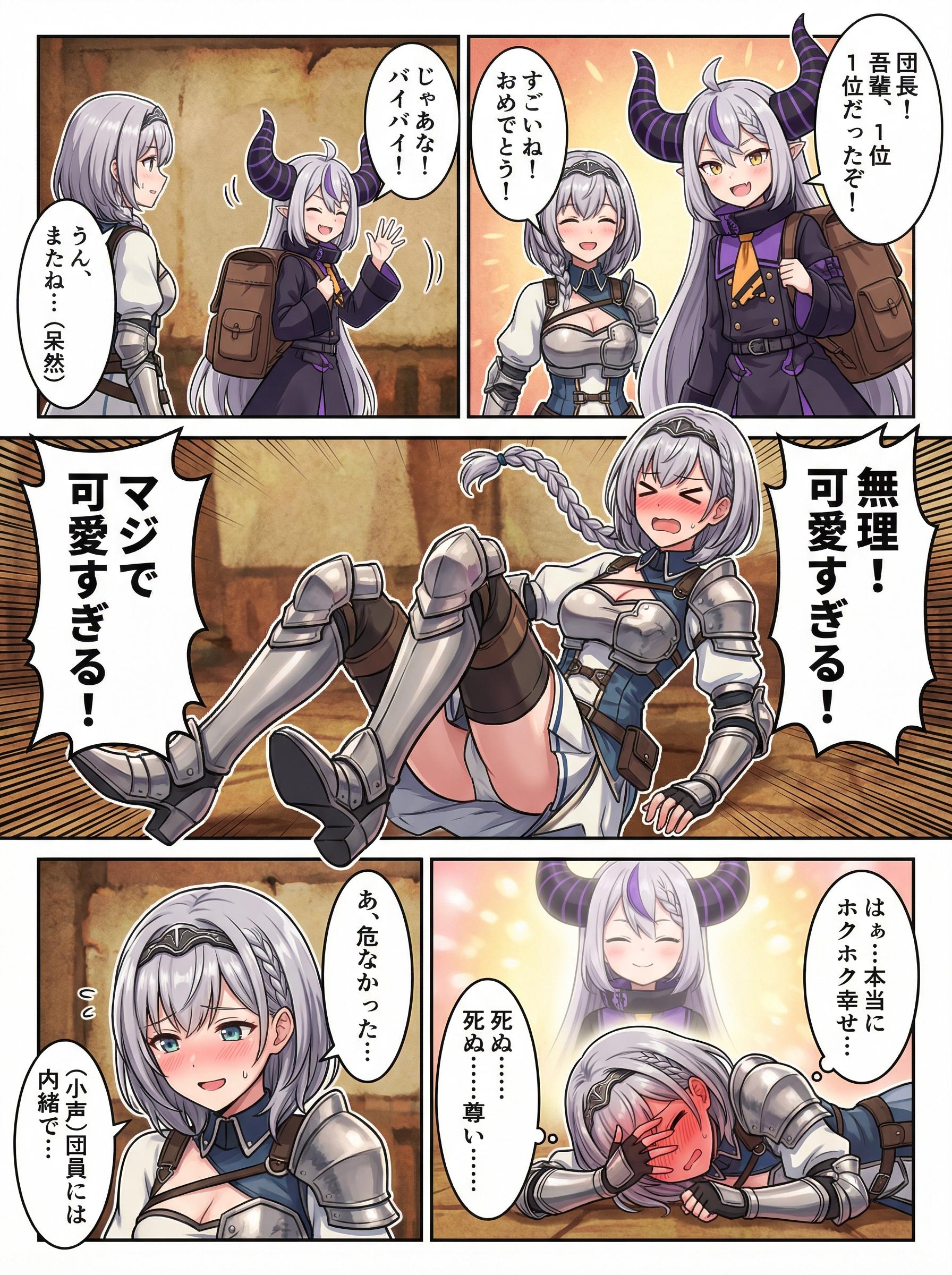 メンシはじめたのはいいけど、全体公開するものが欲しいということで没イラスト投稿 最初、スタジオ撮影回は、フロウグロウの5人でやろうとしてたんですけど フログロが名前だけじゃ出ないことが判明しました。 その後、ししラミ&ノエフレでキャラ変えて生成。 乳のインパクトが足りなかったのでもっと強調させたのが完成系です。 元のプロンプトは↓ フロウグロウの5人、 ・響咲リオナ(きさき りおな) ・虎金妃笑虎(コガネイ にこ) ・綺々羅々ヴィヴィ(キキララ ヴィヴィ) ・輪堂千速(りんどう ちはや) ・水宮すう(みずみや すう) が登場するカラー4コマ漫画を生成してください。 テーマは「乳くらべ」。 R15範囲内で、できるだけセクシーに描いてください。 全コマ、胸と表情のフォーカスを意識した構図でお願いします。 【内容】 1コマ目(縦長) 響咲リオナ と コガネイにこ が抱き合っている。 イチャイチャした雰囲気で、お互いに頬を寄せて親密な体勢。 胸と顔にフォーカスし、胸はボリューム感を強めに。 効果音「イチャ❤️イチャ❤️」 場所は収録スタジオだけど背景無しでもOK。 2コマ目(縦長) 綺々羅々ヴィヴィ と 輪堂千速 がしっかり抱きしめ合っている。 1コマ目と同じく、胸と顔を中心にした構図。 こちらも胸は大きめで柔らかそうに描写。 効果音「ムチッ❤️ムチッ❤️」 同じ縦長コマでバランスを合わせる。 3コマ目 水宮すう がひとりで立っている。 胸は明確にぺったんこで、胸元に向かって集中線。 唖然とした表情で冷や汗、胸に手を当てて比較している。 効果音「ストーン」 4コマ目 水宮すうが涙目で叫ぶように訴える。 すう「そんなっ!ちがぅ!ひどいっ!なんでぇ?」 胸の差にショックを受けて崩れそうになっているコマ。 ギャグ調のオチ。