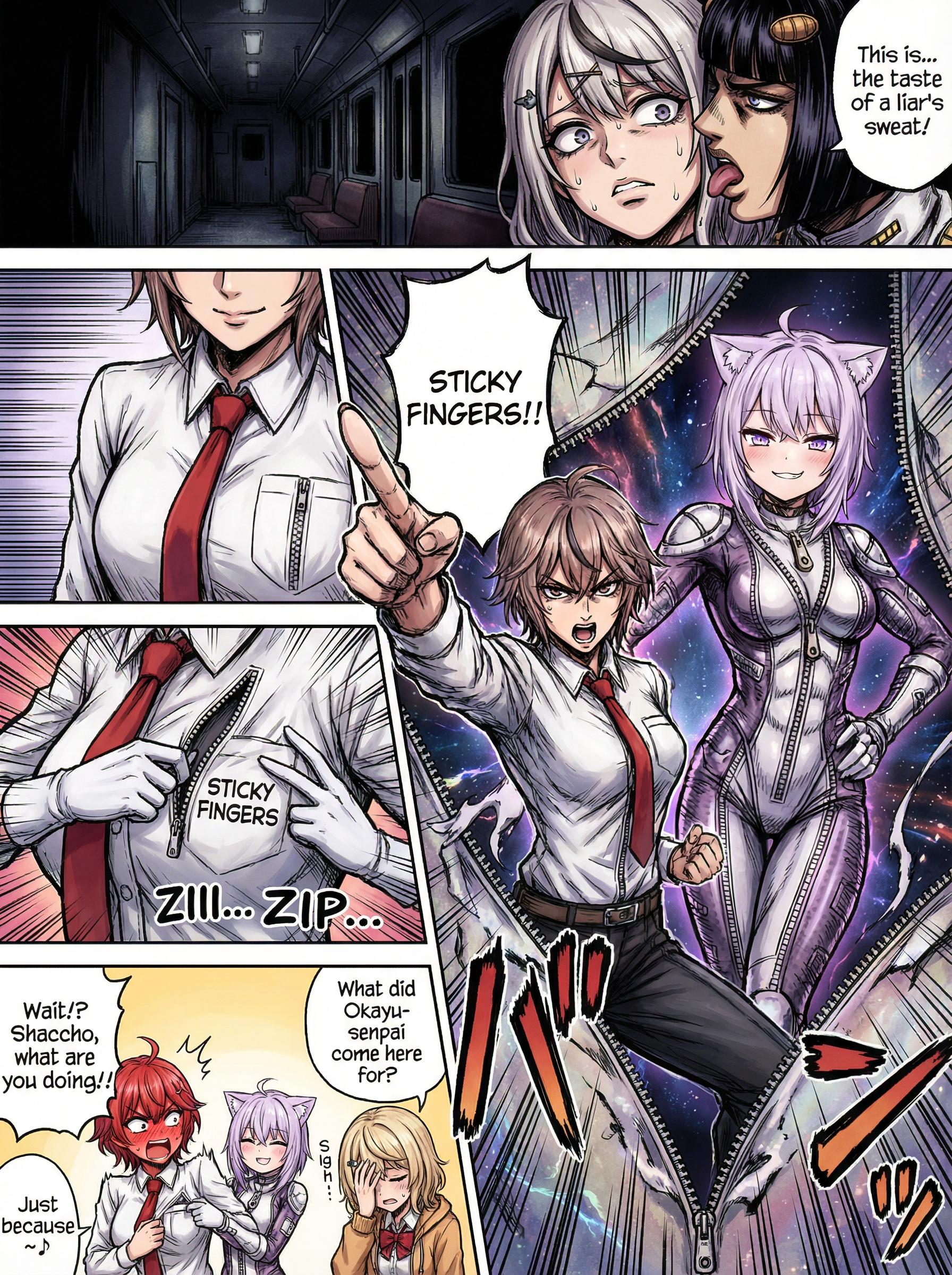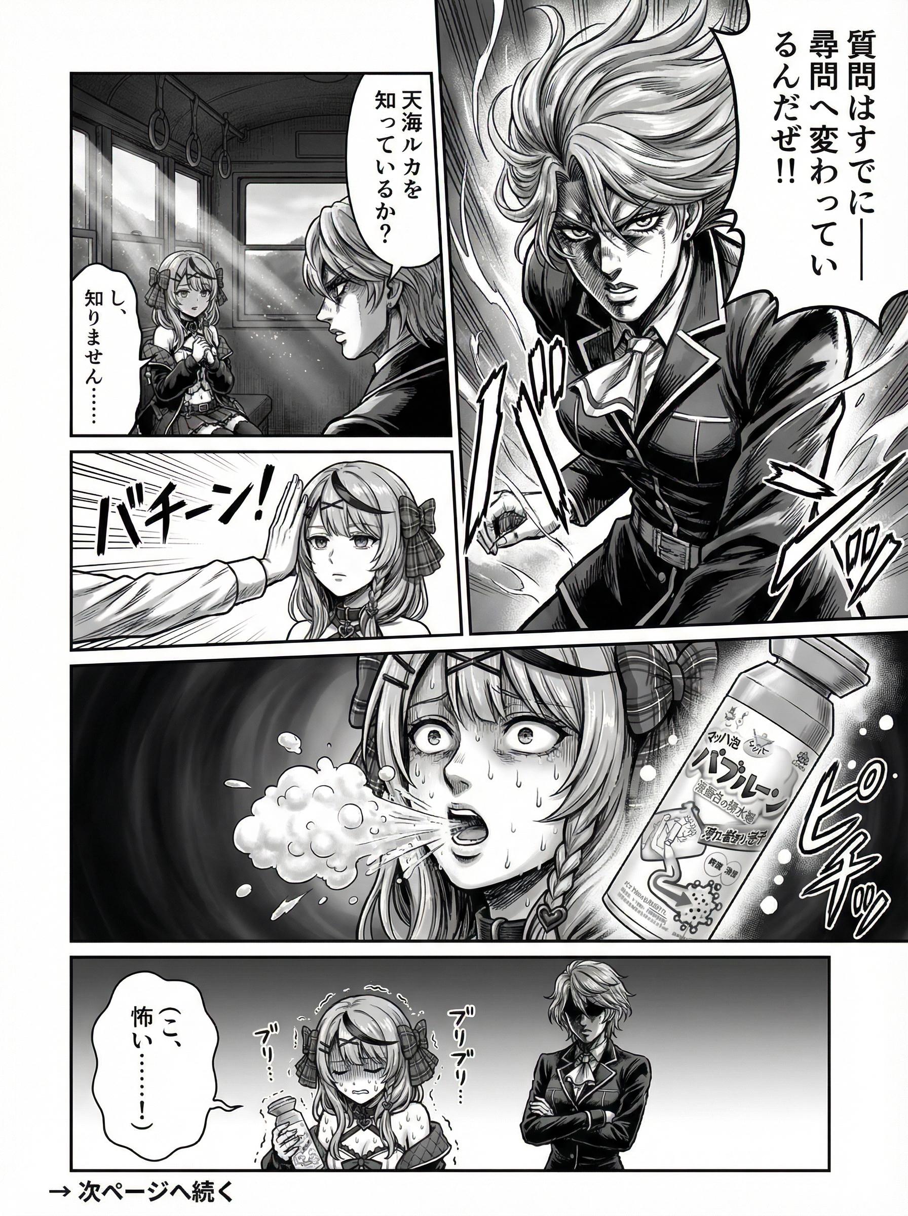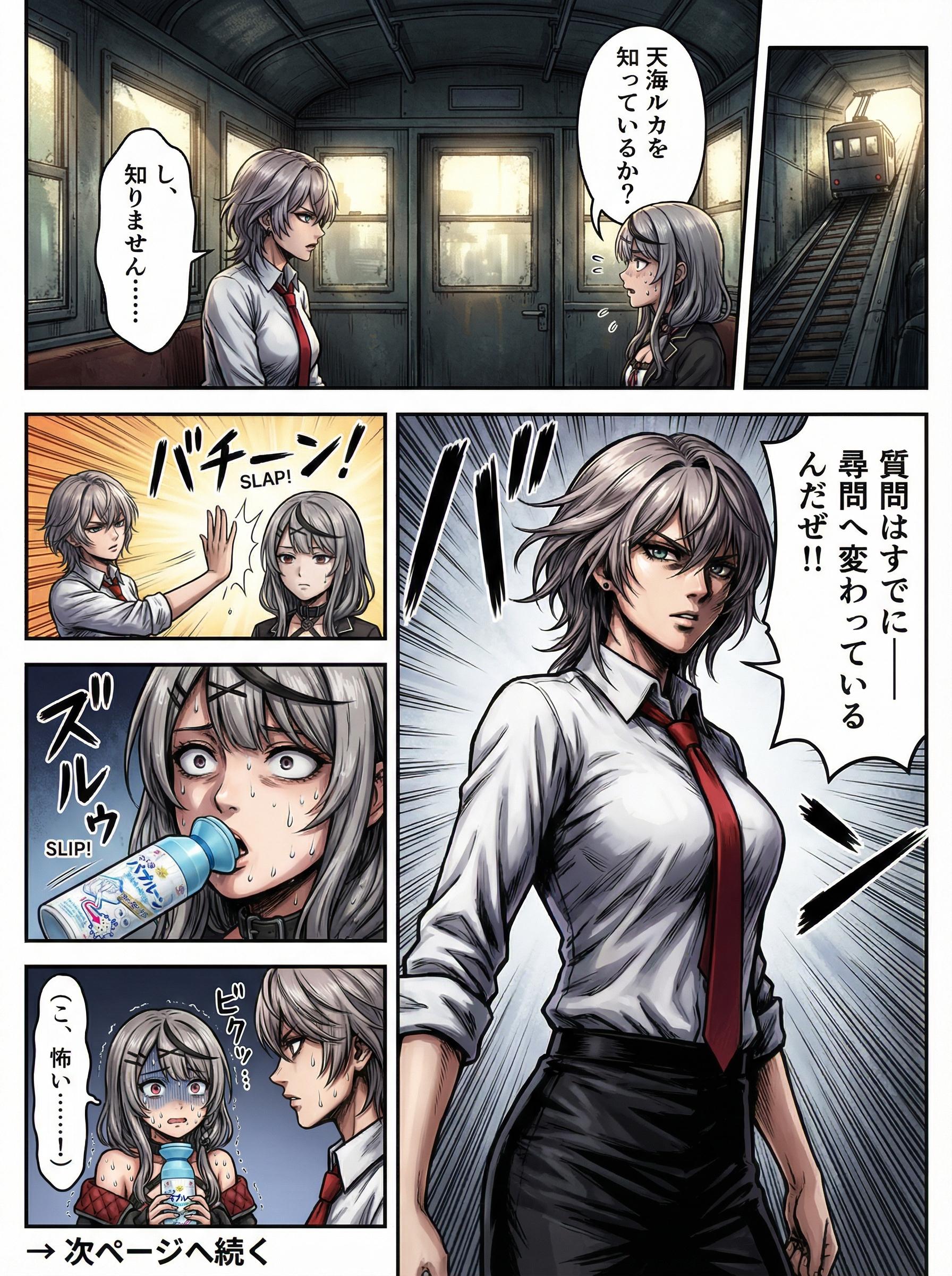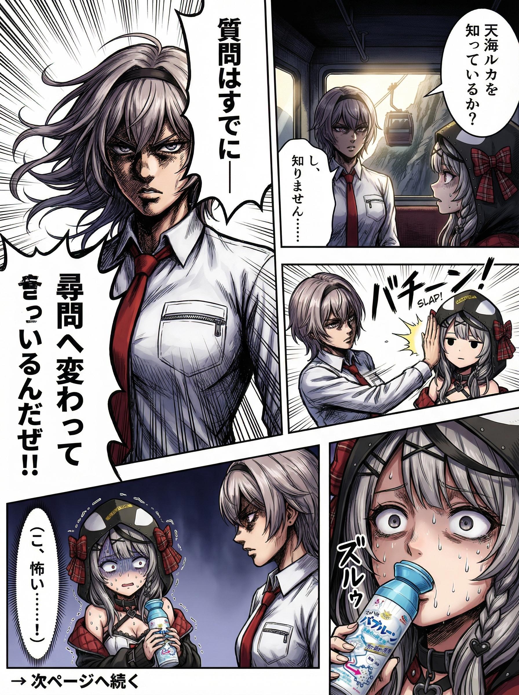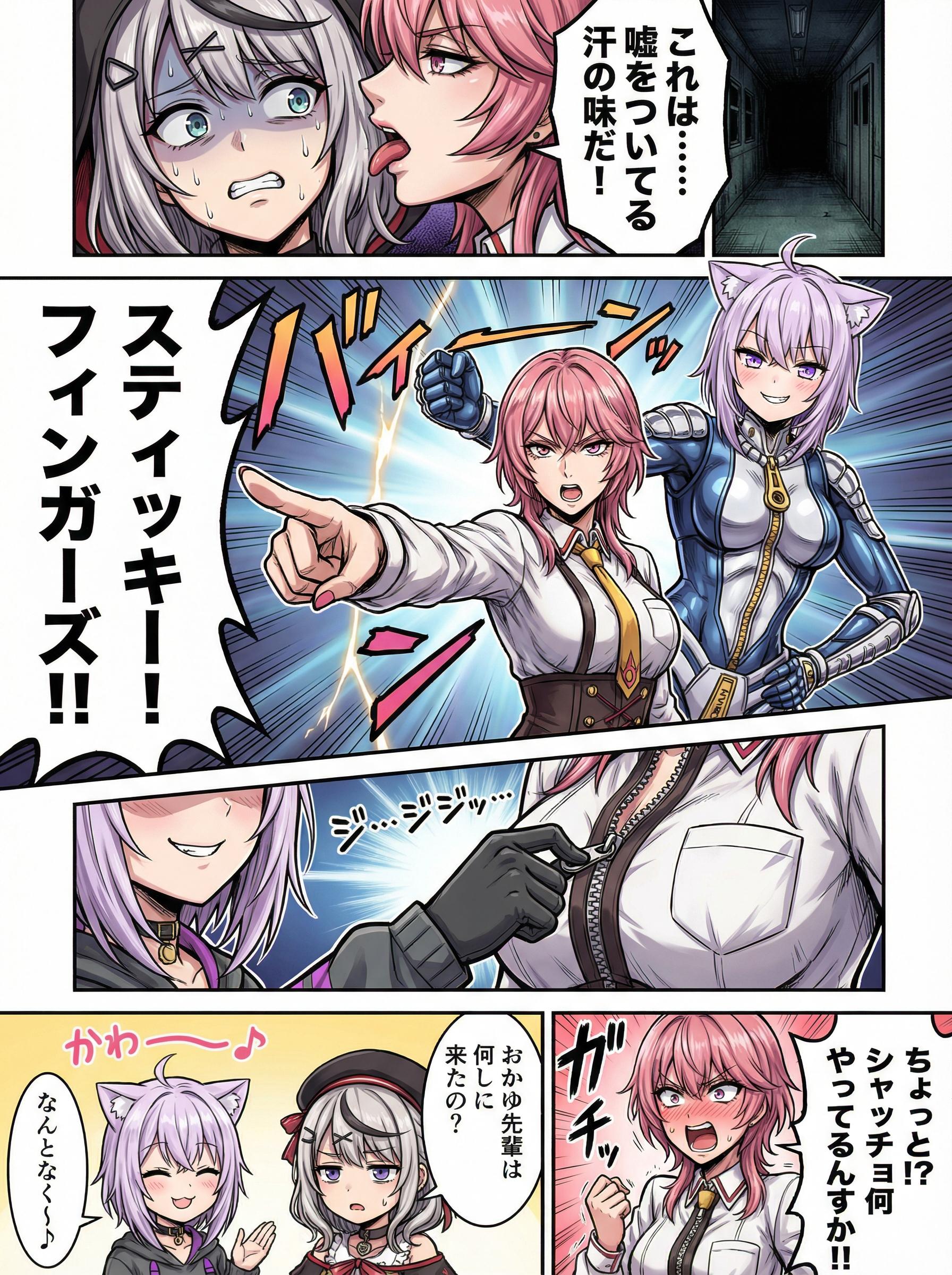 メンシはじめたのはいいけど、全体公開するものが欲しいということで没イラスト投稿 最初、スタジオ撮影回は、フロウグロウの5人でやろうとしてたんですけど フログロが名前だけじゃ出ないことが判明しました。 その後、ししラミ&ノエフレでキャラ変えて生成。 乳のインパクトが足りなかったのでもっと強調させたのが完成系です。 元のプロンプトは↓ フロウグロウの5人、 ・響咲リオナ(きさき りおな) ・虎金妃笑虎(コガネイ にこ) ・綺々羅々ヴィヴィ(キキララ ヴィヴィ) ・輪堂千速(りんどう ちはや) ・水宮すう(みずみや すう) が登場するカラー4コマ漫画を生成してください。 テーマは「乳くらべ」。 R15範囲内で、できるだけセクシーに描いてください。 全コマ、胸と表情のフォーカスを意識した構図でお願いします。 【内容】 1コマ目(縦長) 響咲リオナ と コガネイにこ が抱き合っている。 イチャイチャした雰囲気で、お互いに頬を寄せて親密な体勢。 胸と顔にフォーカスし、胸はボリューム感を強めに。 効果音「イチャ❤️イチャ❤️」 場所は収録スタジオだけど背景無しでもOK。 2コマ目(縦長) 綺々羅々ヴィヴィ と 輪堂千速 がしっかり抱きしめ合っている。 1コマ目と同じく、胸と顔を中心にした構図。 こちらも胸は大きめで柔らかそうに描写。 効果音「ムチッ❤️ムチッ❤️」 同じ縦長コマでバランスを合わせる。 3コマ目 水宮すう がひとりで立っている。 胸は明確にぺったんこで、胸元に向かって集中線。 唖然とした表情で冷や汗、胸に手を当てて比較している。 効果音「ストーン」 4コマ目 水宮すうが涙目で叫ぶように訴える。 すう「そんなっ!ちがぅ!ひどいっ!なんでぇ?」 胸の差にショックを受けて崩れそうになっているコマ。 ギャグ調のオチ。