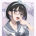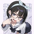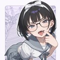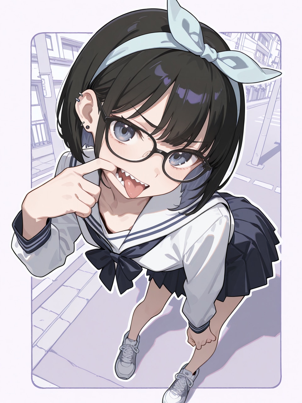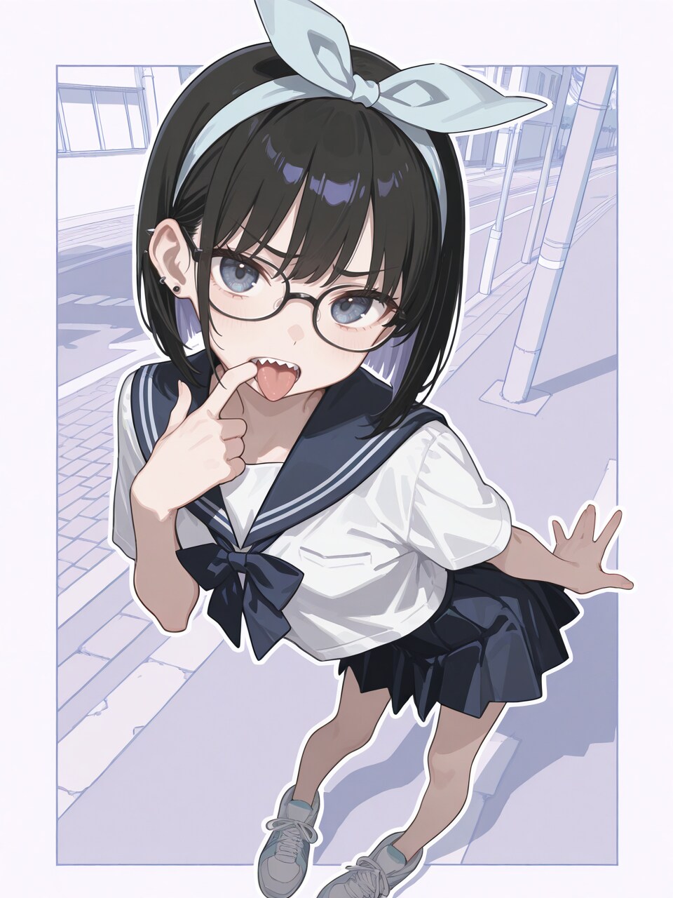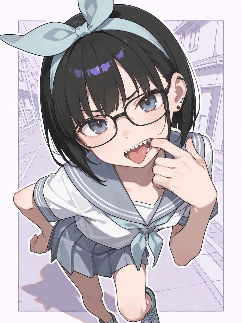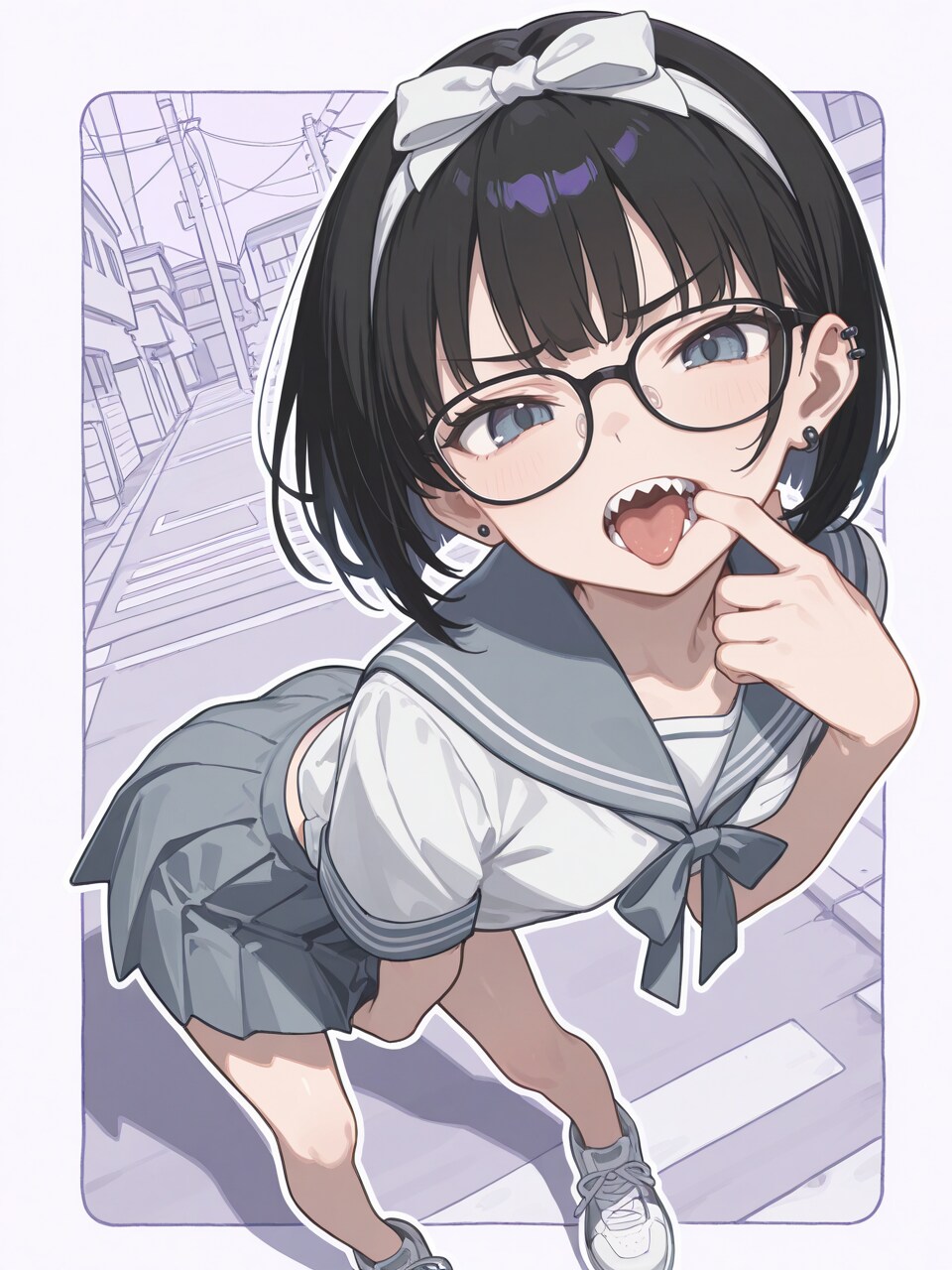 (glasses:1.2), (wide open mouth:1.2), (finger in own mouth:1.1), sharp teeth,