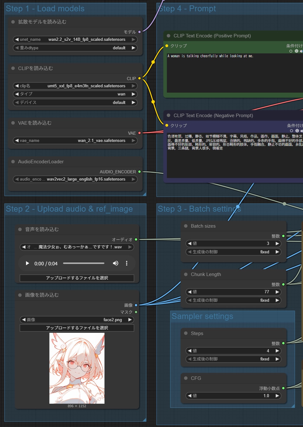今回はWan2.2のS2Vモデルを使って、セリフ音声と画像から、読み上げ動画を作ってみました。 S2Vは、音声からそれに合った動画を生成するものですが、元画像を指定するとそれをもとにI2Vのように画像に沿った動画を生成してくれます。 前回使った魔法少女画像の顔アップ(2枚目)を元画像に指定し、音声として「魔法少女Muacca、いつもみんなと楽しく、ですです」という読み上げ音声を指定してできたのが1枚目の動画です。 残念ながらちちぷいには音声付の動画は投稿できないので、口パクだけになってしまいますが、元画像のキャラがなにかしゃべっている感じになっているのは分かるかと思います。 Wan2.2 S2Vですが、UIとしては公式から配布されているComfyUIワークフローを用いて実行しました(3枚目)。 基本的にはデフォルト値のままで使うのがいいようです。 ちなみに16fpsが指定されているのですが、これを30fpsとかにすると音声と口パクがズレるので、変えないほうが良いようです。fpsを変更したい場合は、生成した動画を別のツールでフレーム補間すればよいと思います。 あと、公式の情報では生成される動画は77フレーム分と書いてあって、これは変更しないほうが良いとのことでした。16fpsだと4秒くらいの動画になるはずなのですが、結果として生成されたのは14秒くらいのものだったので、それがなぜなのかはよくわかりません。投入した音声は4秒くらいだったので、ここに投稿しているものは後ろの無音声部分をカットしてあります。
