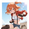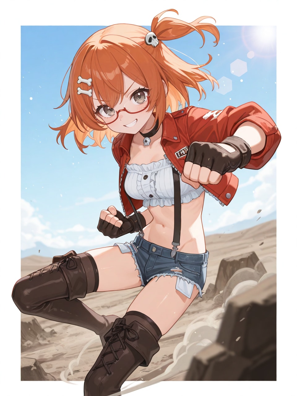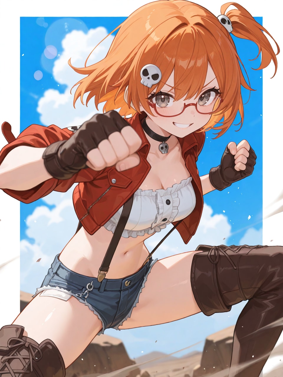 white tube top, red cropped short jacket, denim micro shorts, suspenders, leather thigh boots,