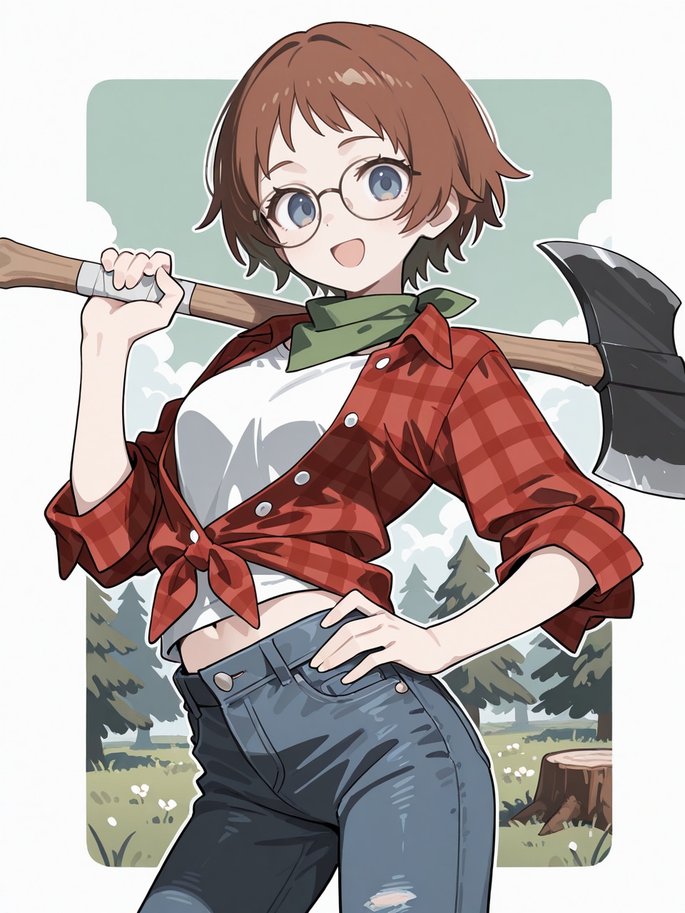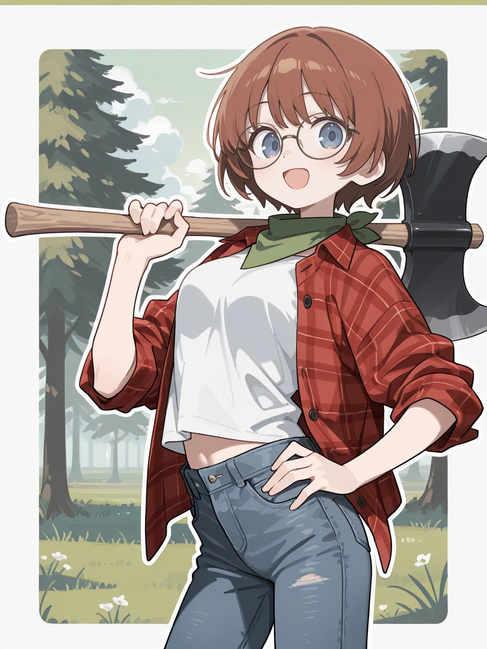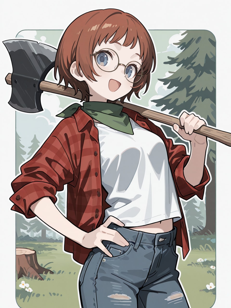 (red plaid shirt:1.1), sleeves rolled up, unbuttoned shirt, white t-shirt, jeans,