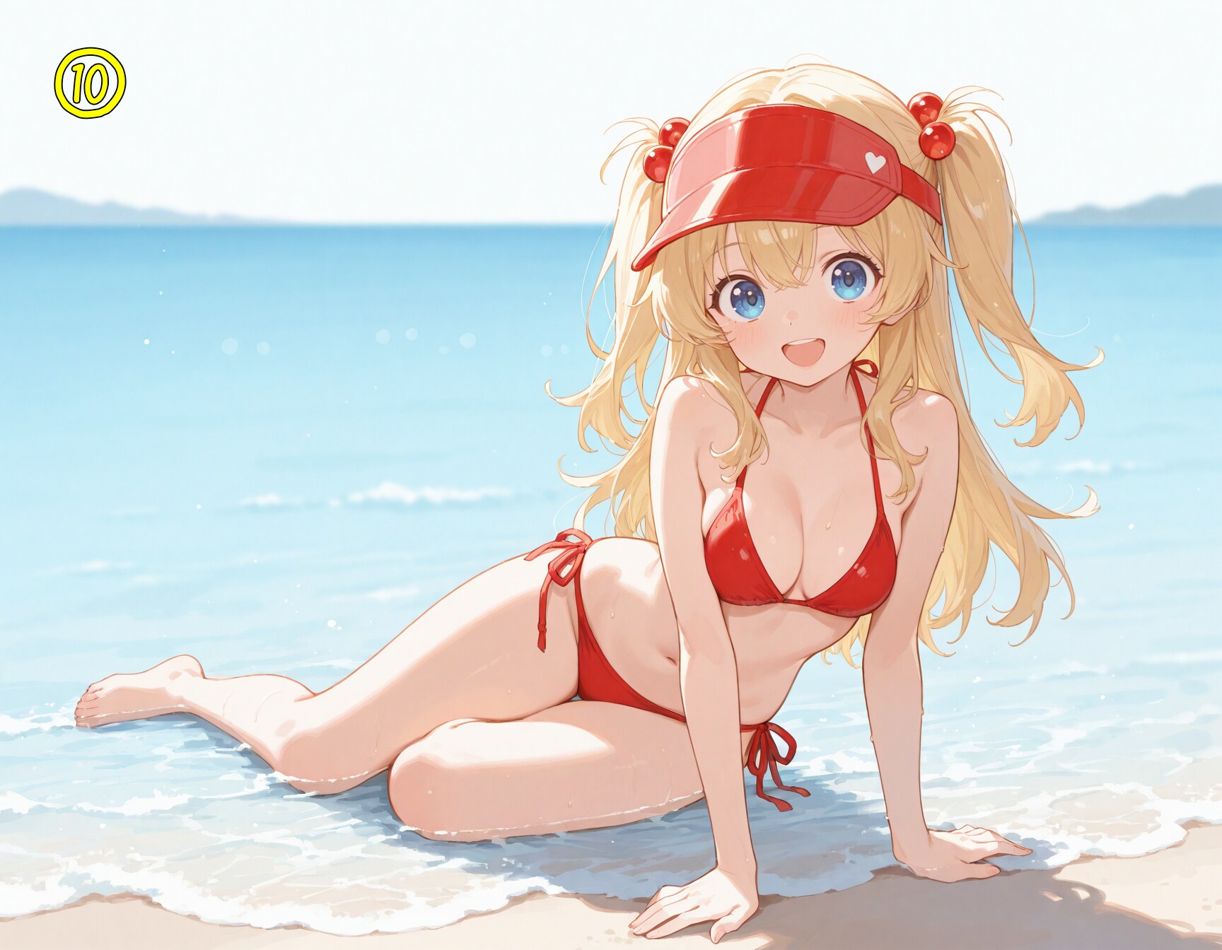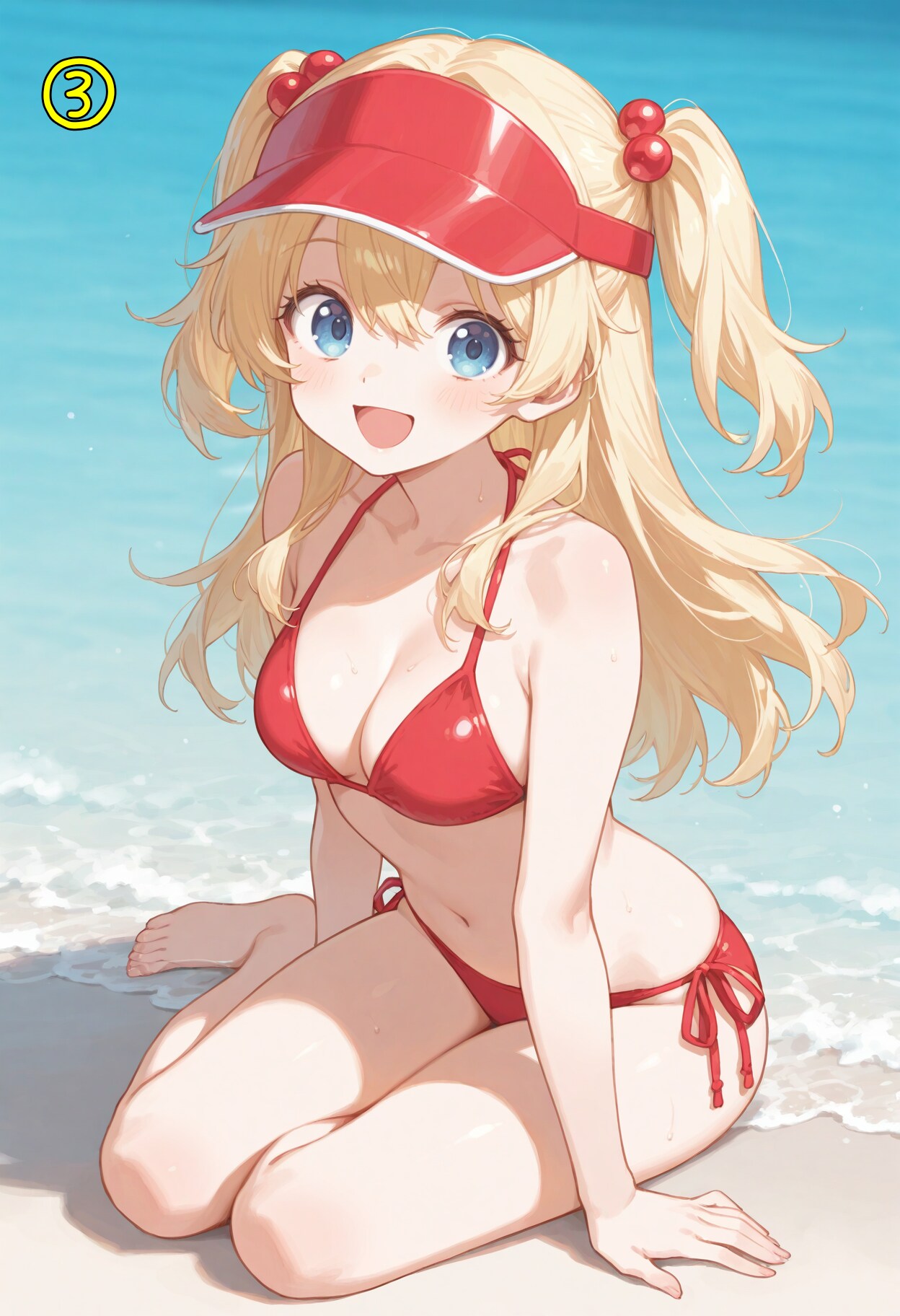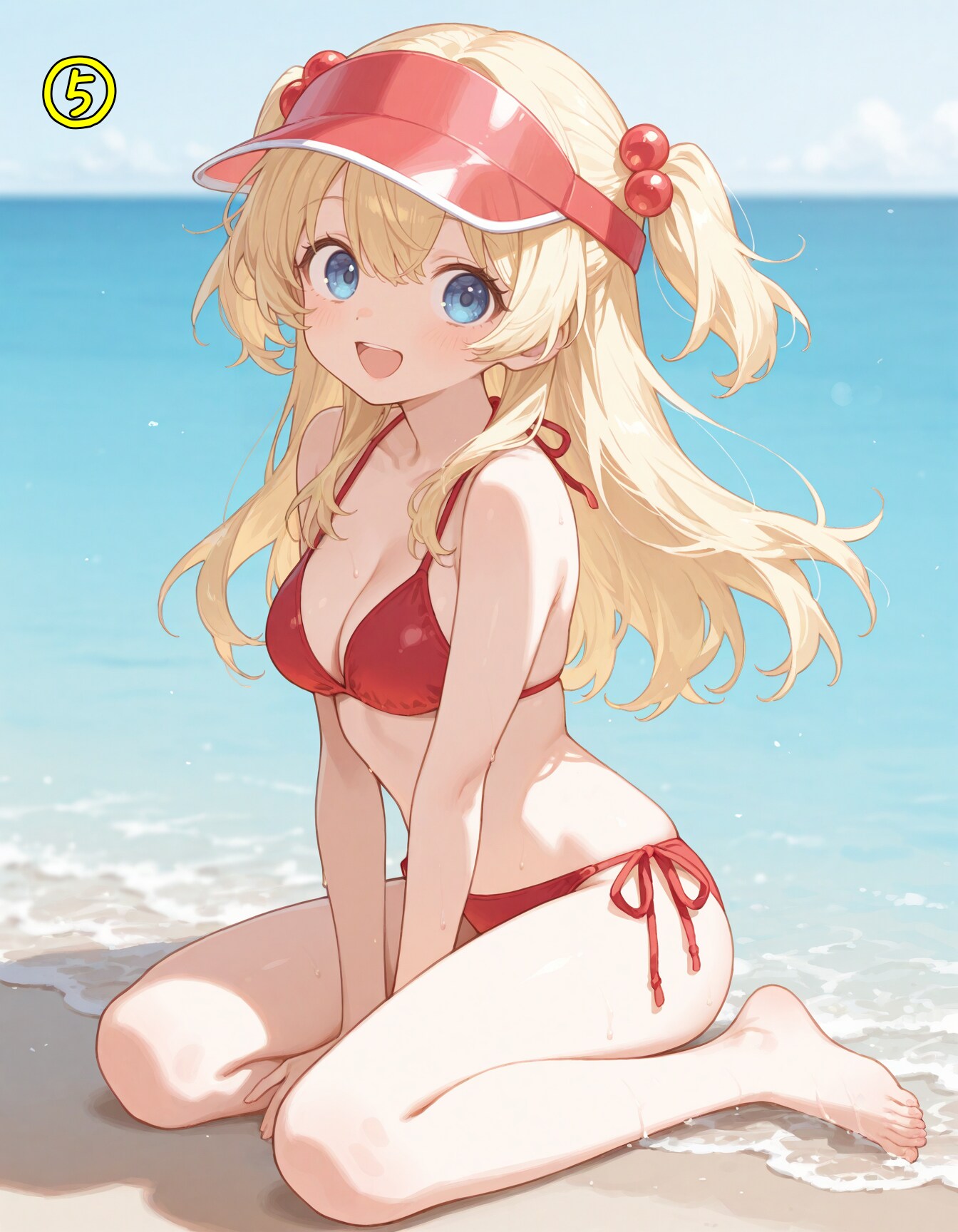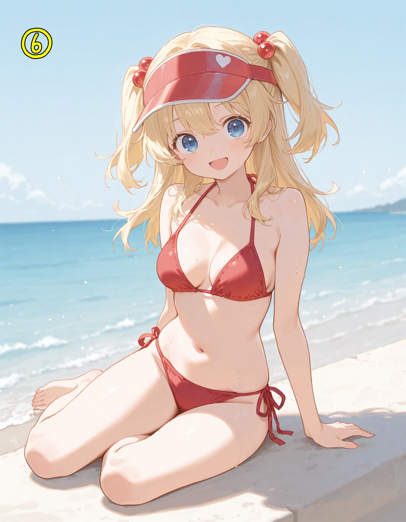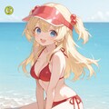 red bikini,side-tie bikini bottom,visor cap,red cap,