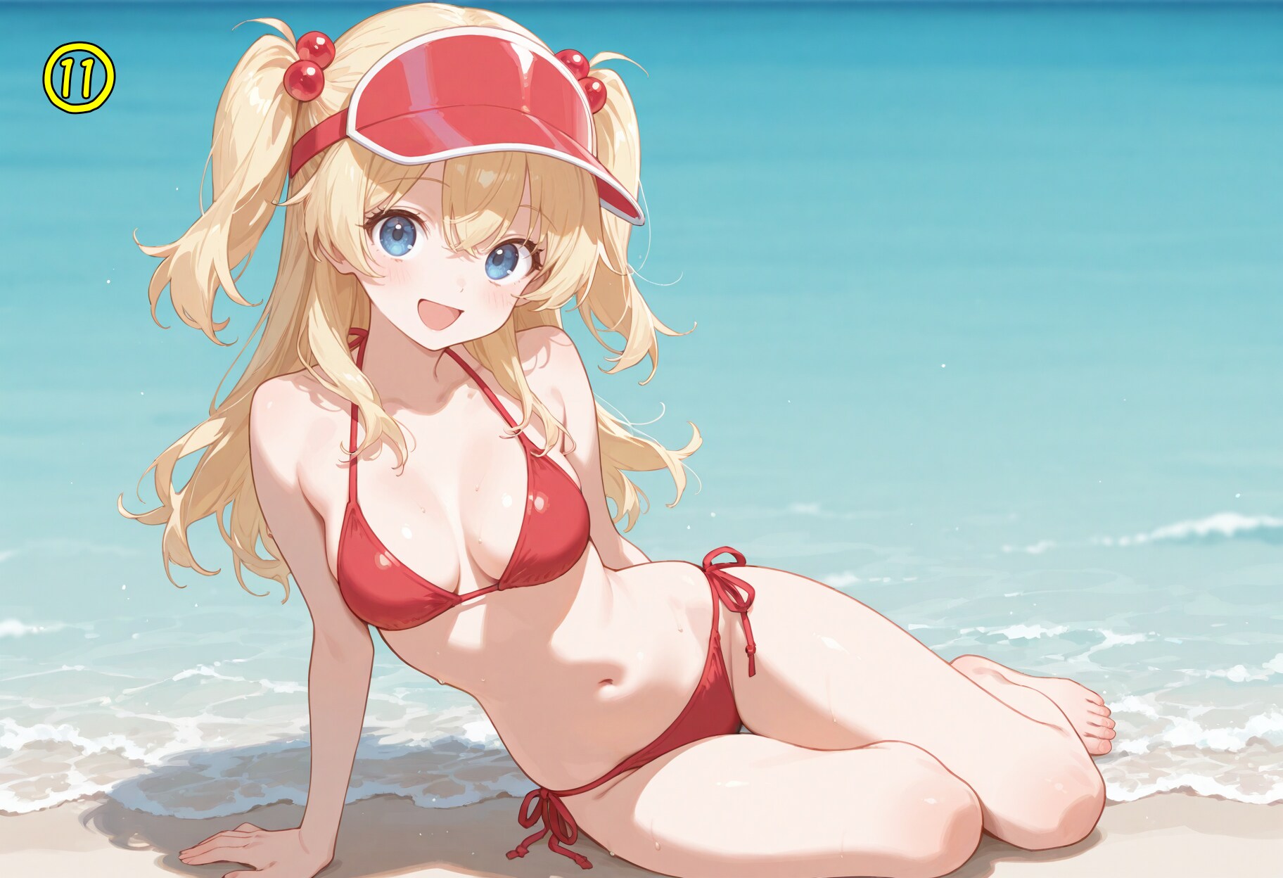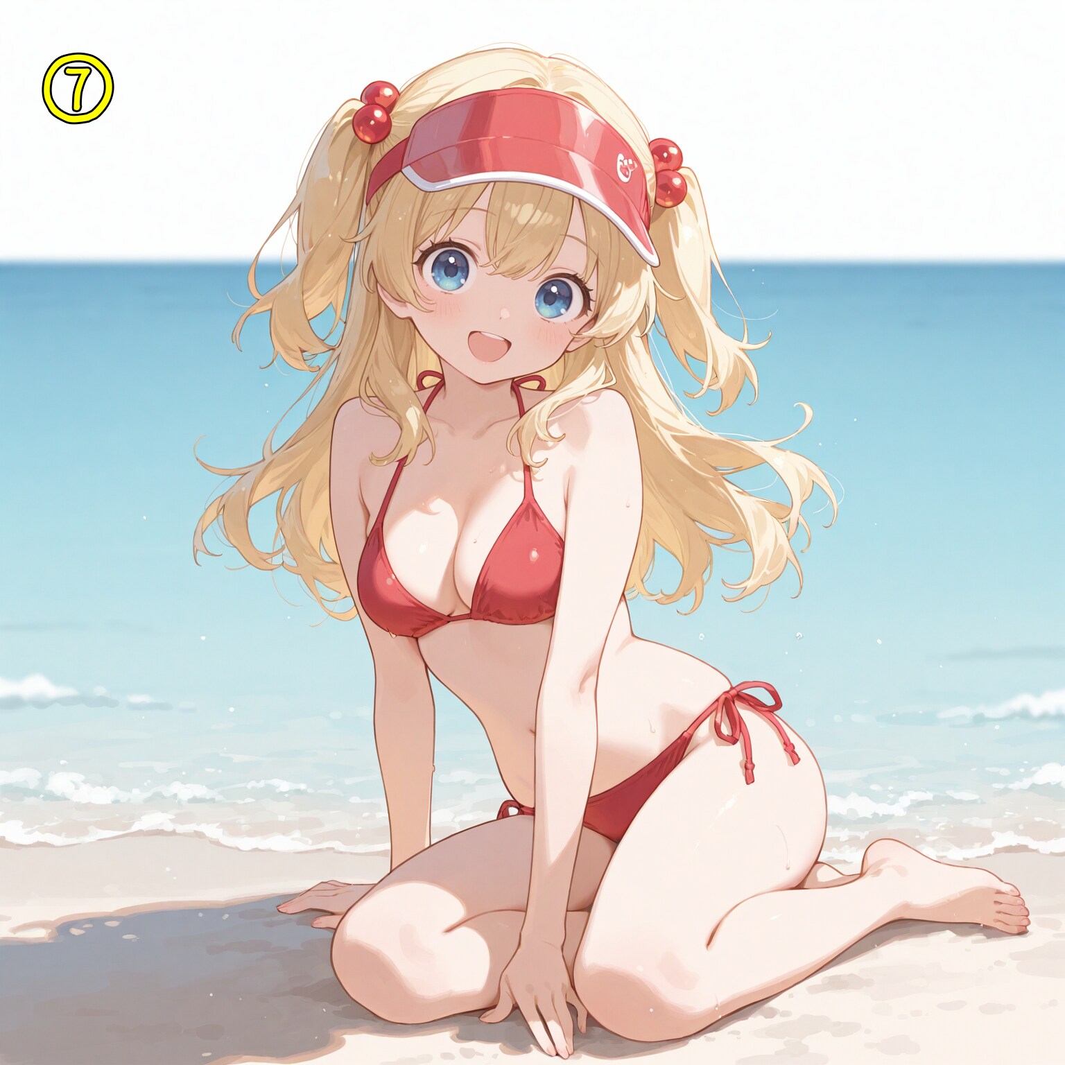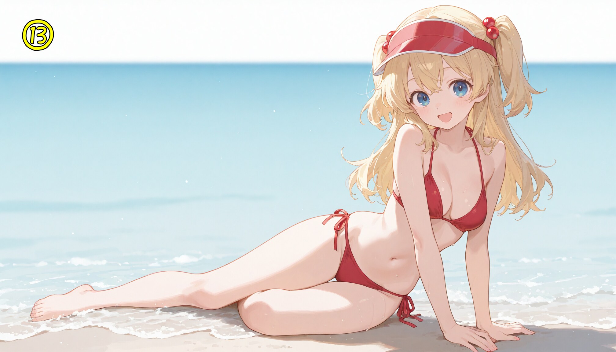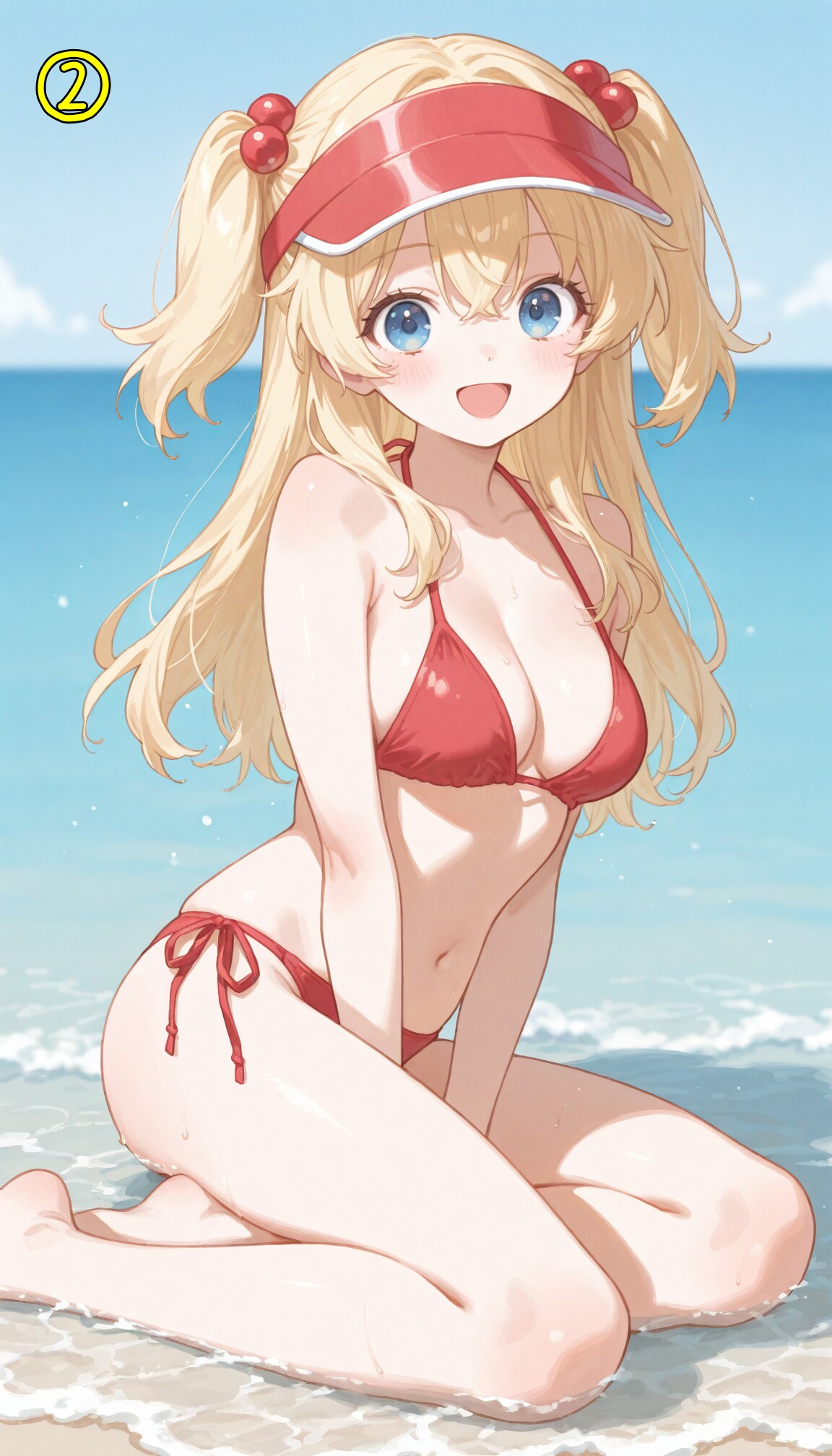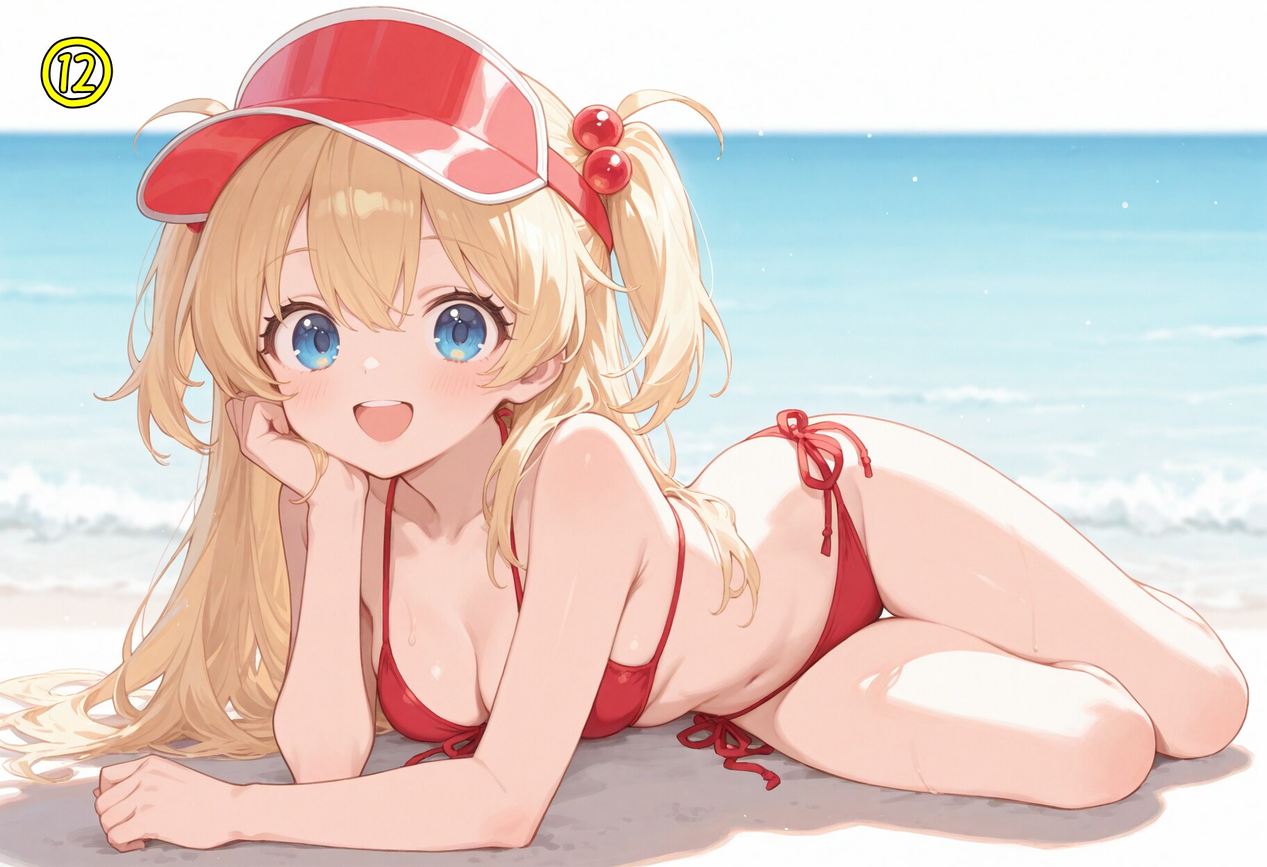 red bikini,side-tie bikini bottom,visor cap,red cap,