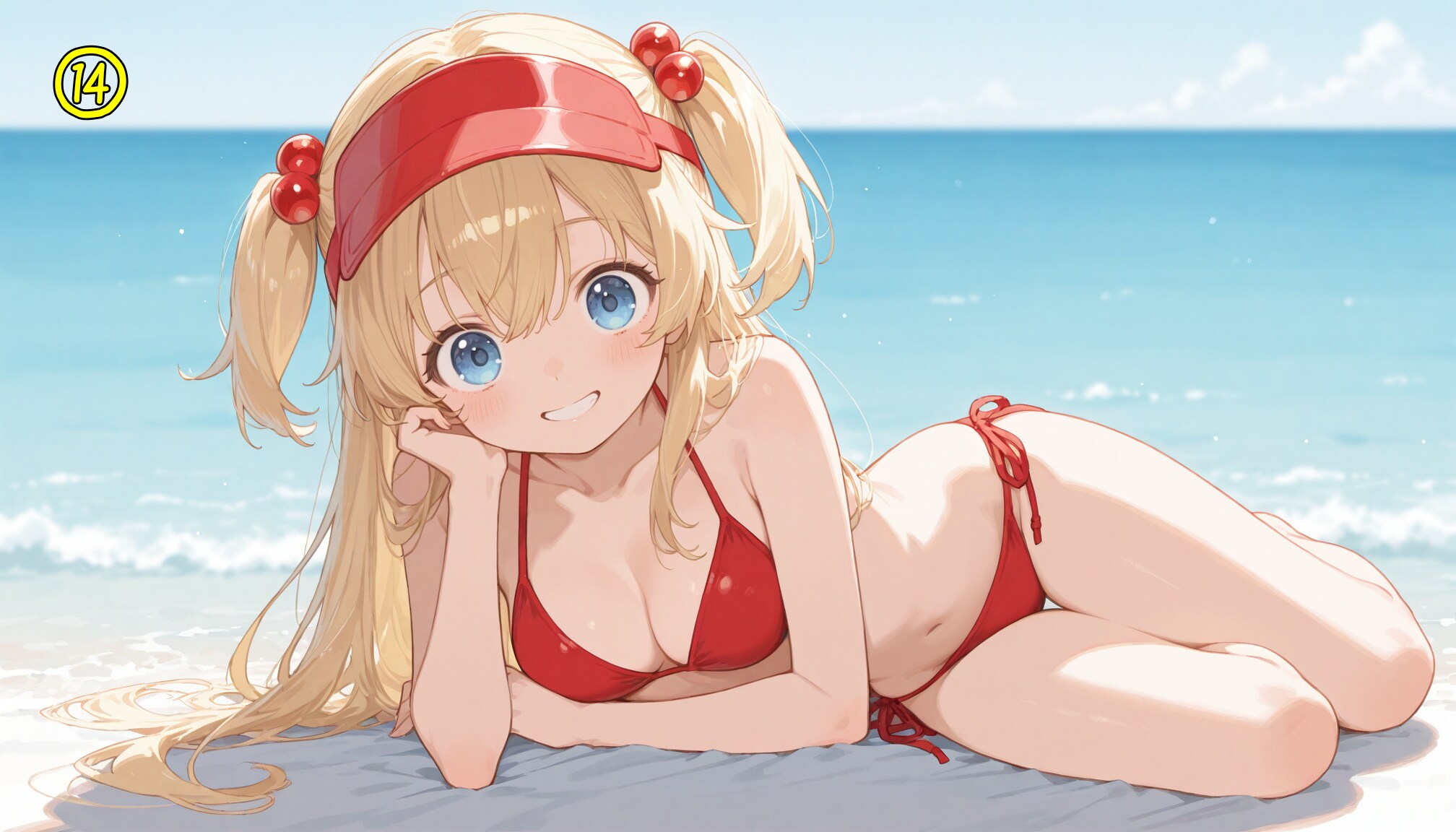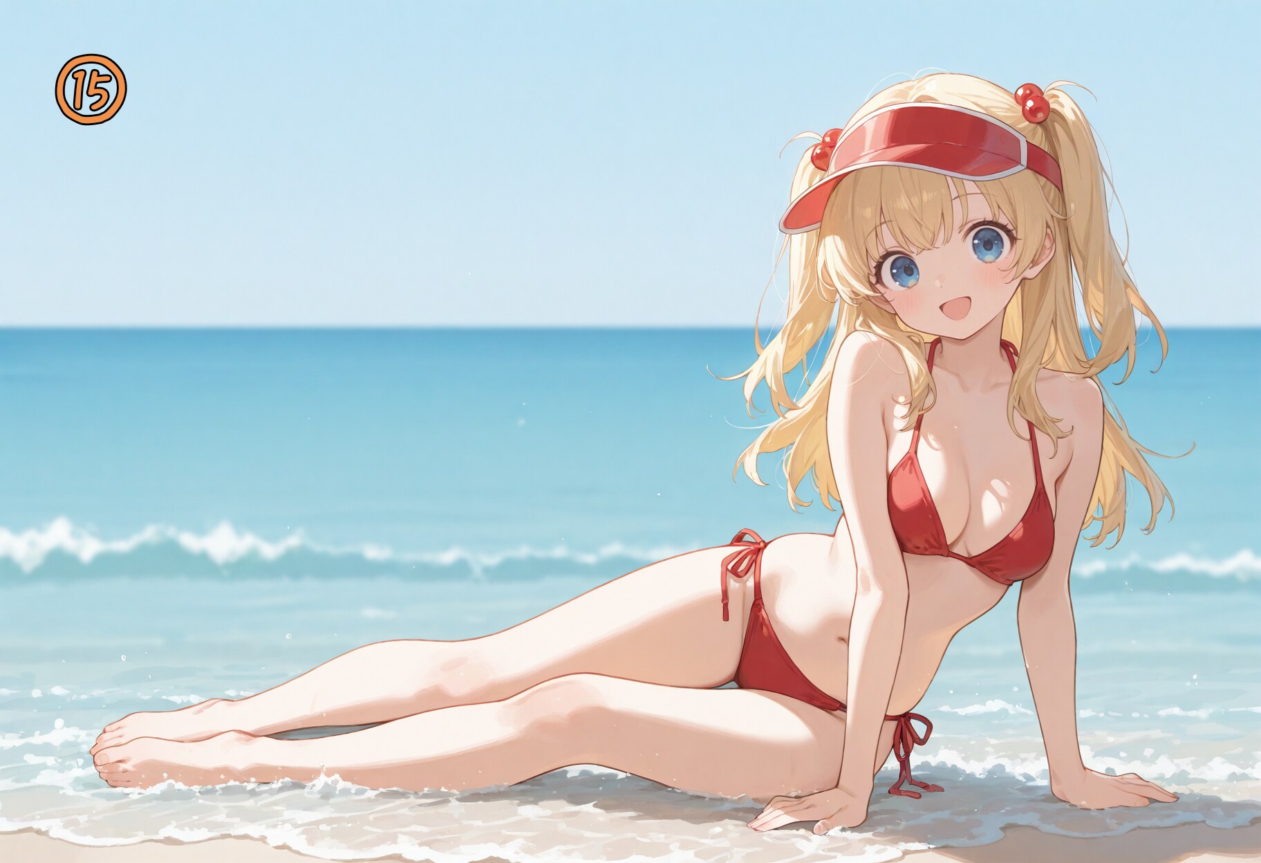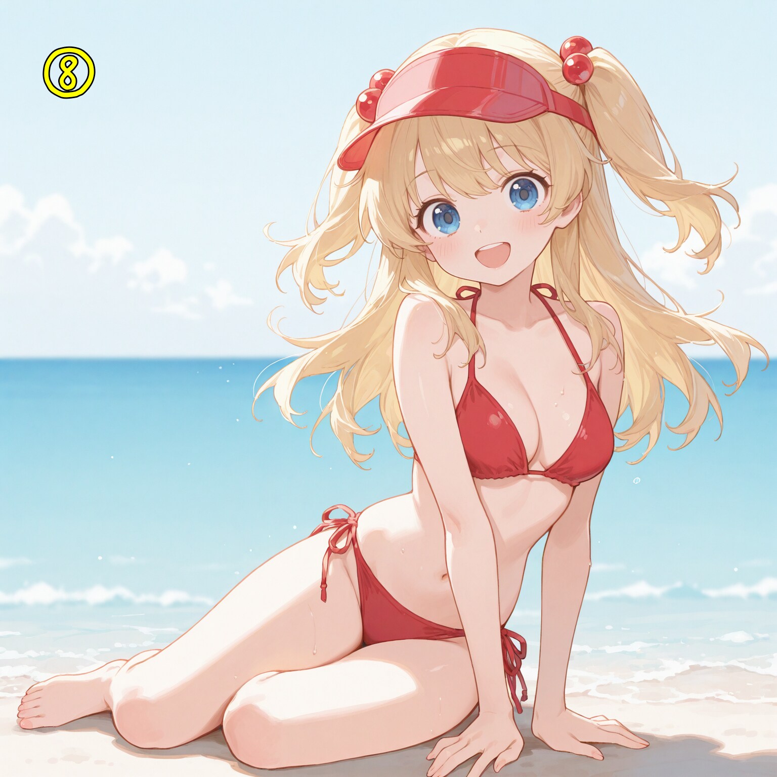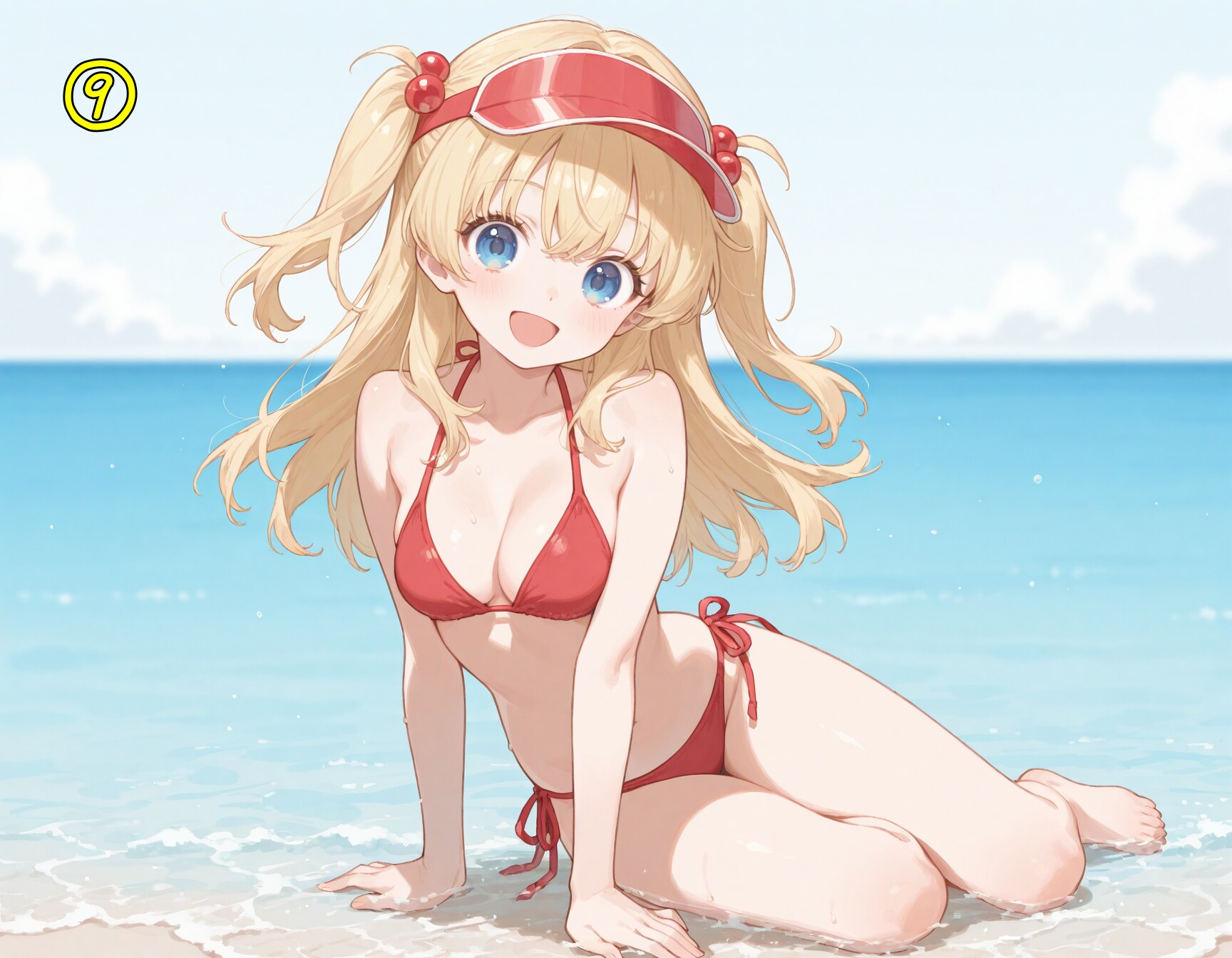 red bikini,side-tie bikini bottom,visor cap,red cap,
