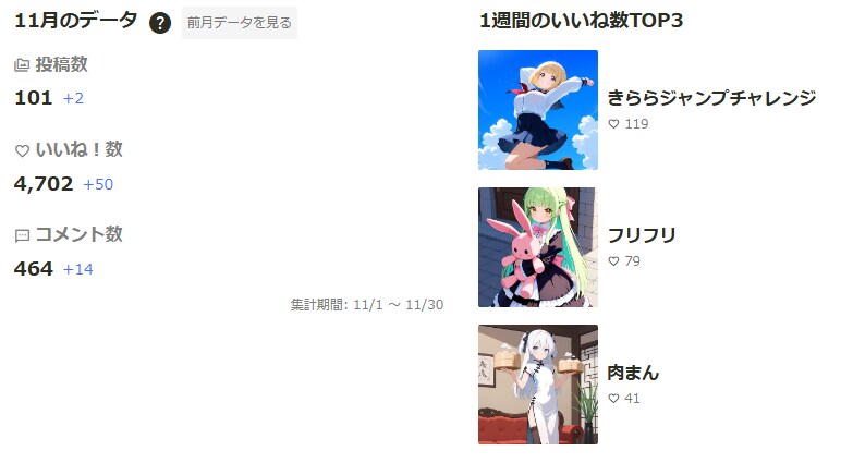先月比でいいね数が1000弱増加 ユーザー企画が終わったあとに謎のブーストが掛かったのでそこで稼げた模様 コメント数が増えているのはユーザー企画でコメ廻りをしたりして交流が増えたからだと思う