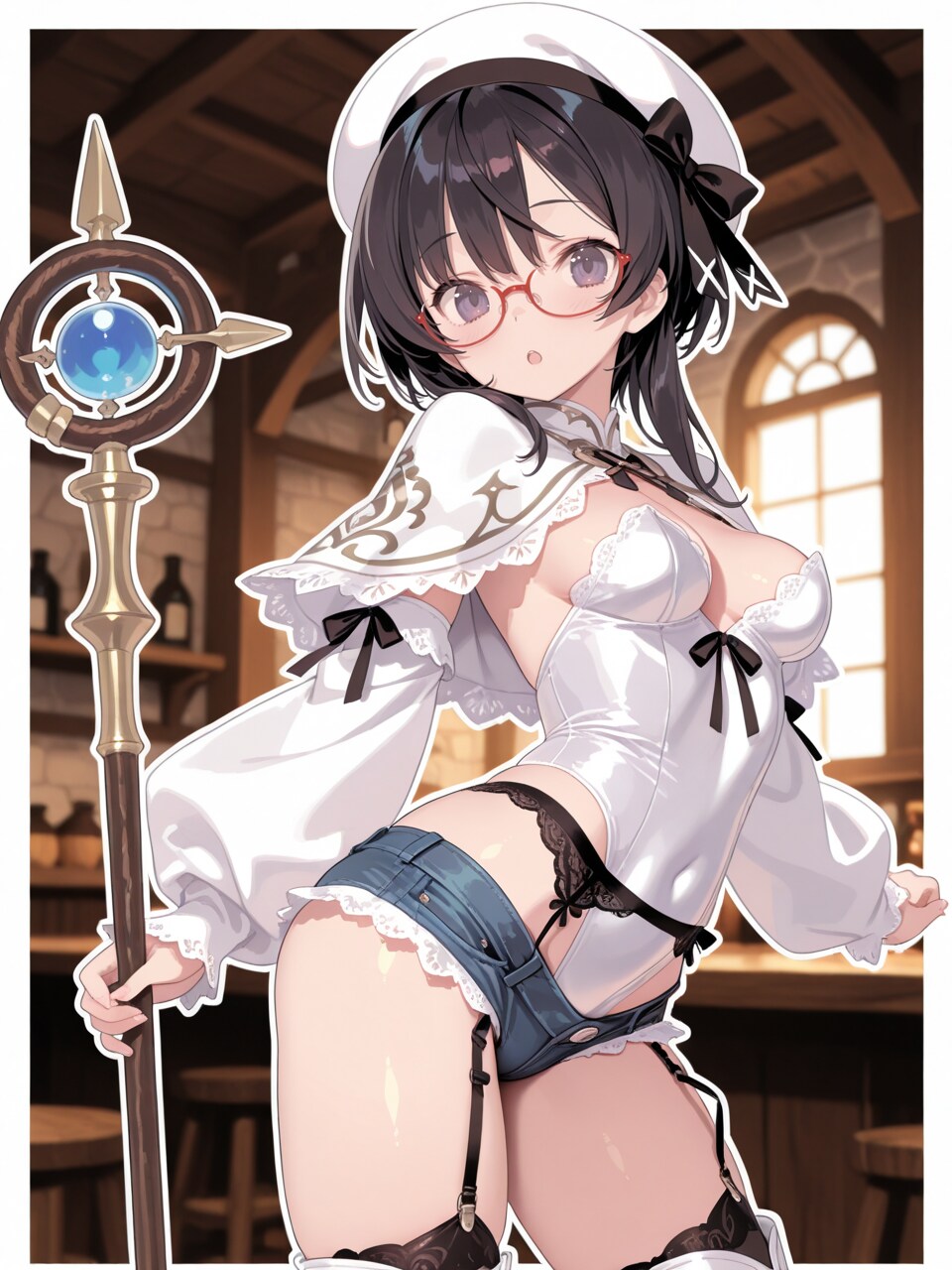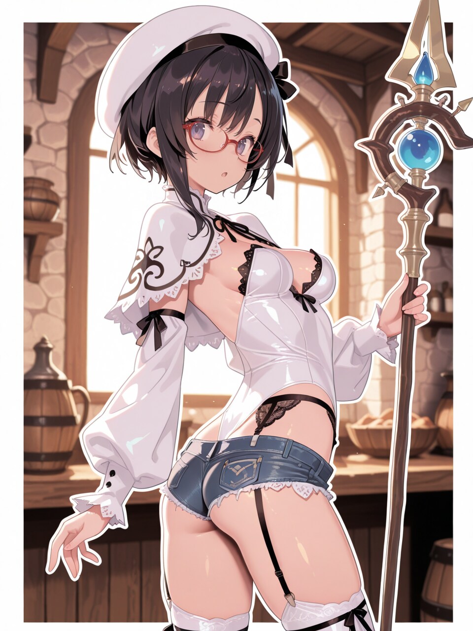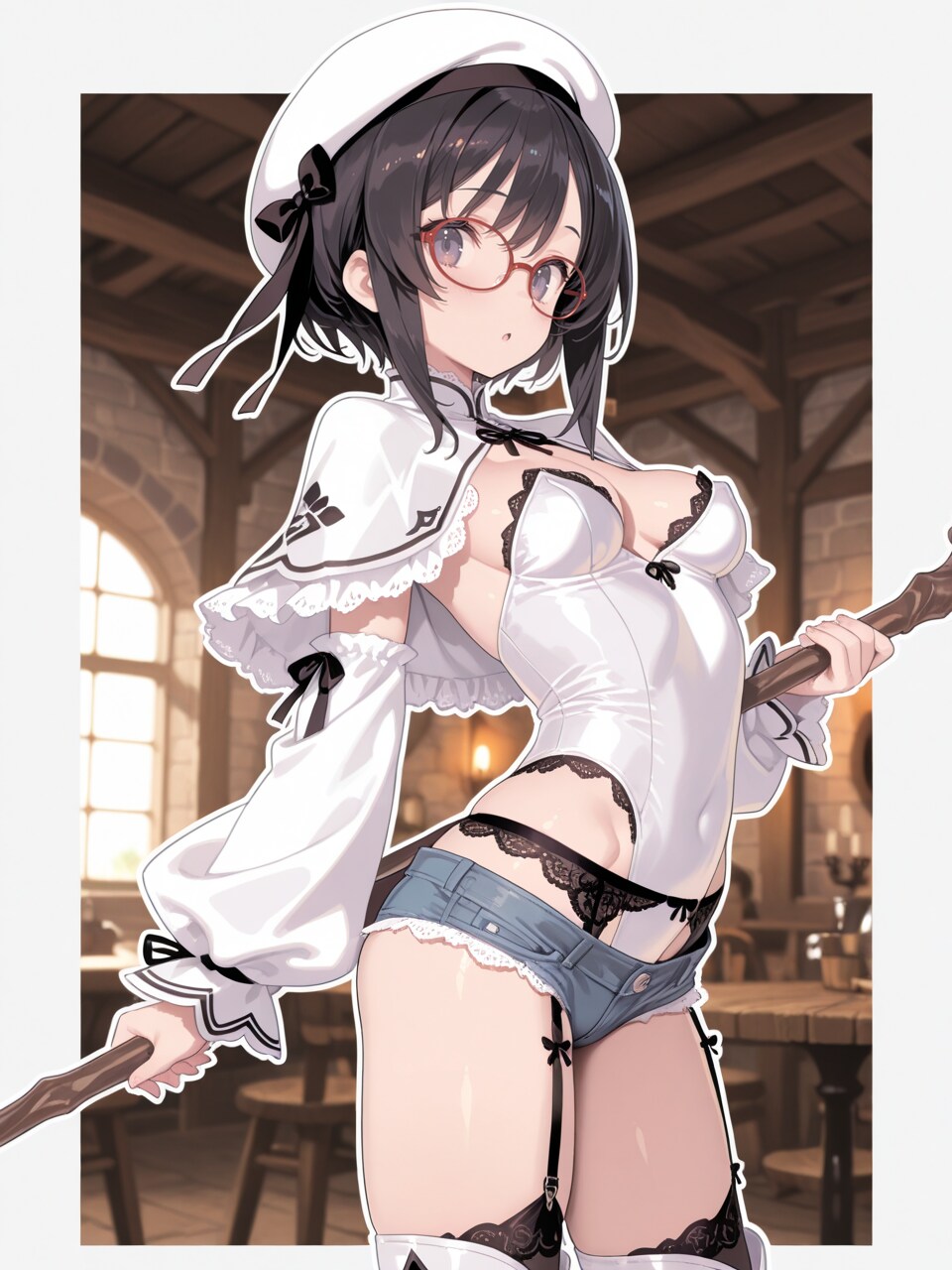 (groin, cleavage:0.8), holding wooden staff